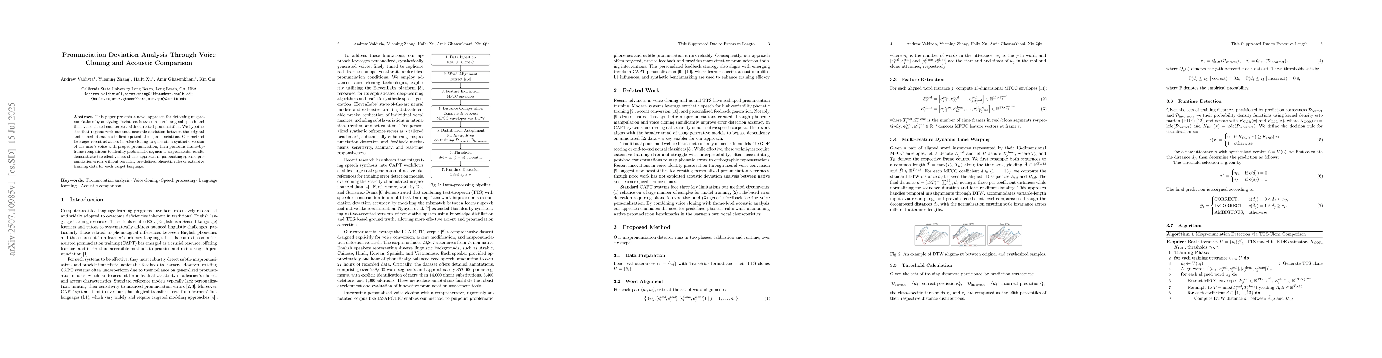 The paper presents a voice cloning and acoustic comparison method for pronunciation deviation analysis, eliminating the need for predefined phonetic rules while maintaining native pronunciation benchmarks in the learner's voice characteristics.