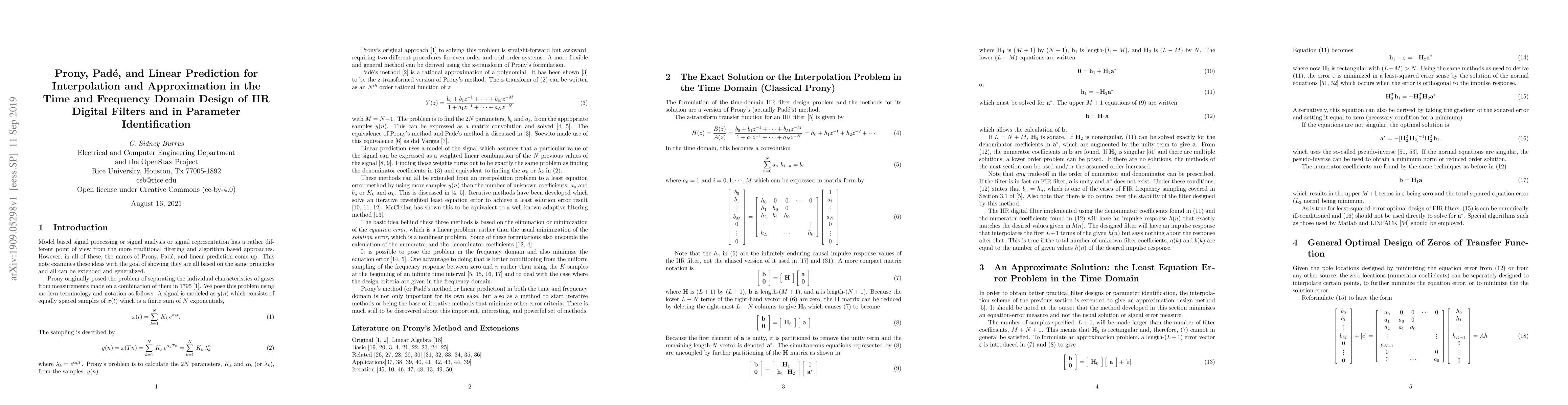 This paper explores the connection between Prony, Pad’e, and linear prediction methods in signal processing and filter design, highlighting their shared principles and potential for generalization.