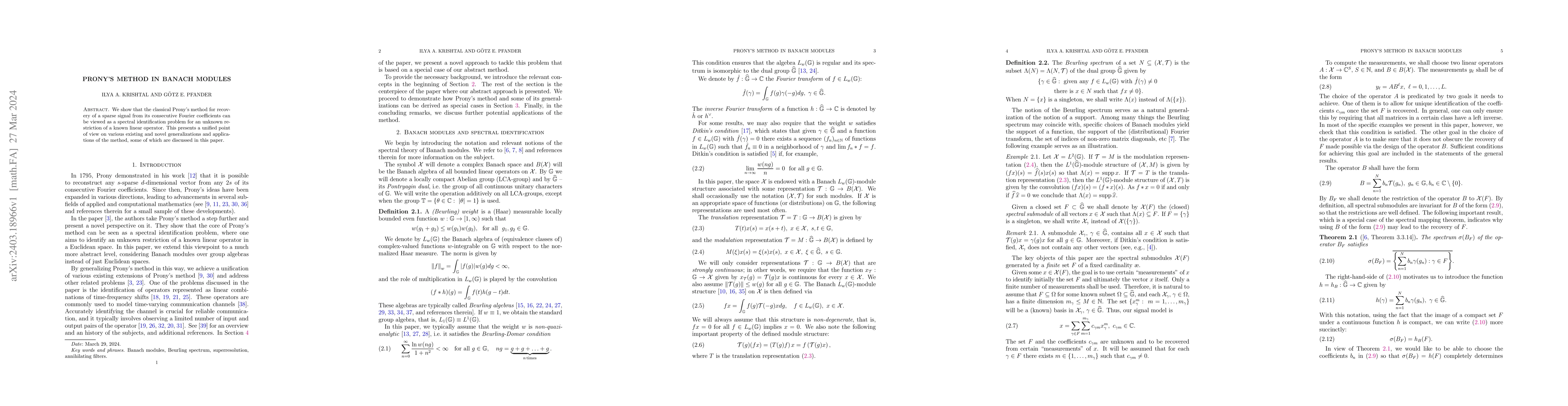 Summary: Prony's method is reinterpreted as a spectral identification problem in Banach modules, providing a unified framework for its various existing and novel generalizations and applications. This perspective enhances the method's applicability across diverse fields.