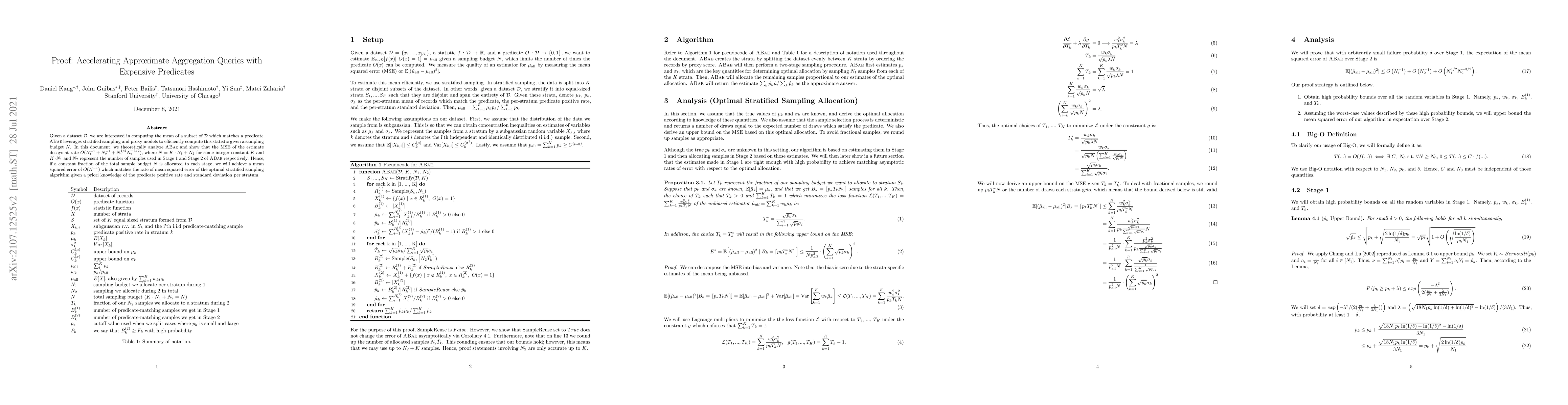 This paper presents ABae, a method for accelerating approximate aggregation queries with expensive predicates using stratified sampling and proxy models. Theoretical analysis shows that ABae achieves a mean squared error decay rate of $O(N_1^{-1} + N_2^{-1} + N_1^{1/2}N_2^{-3/2})$, achieving optimal error rates when allocating a constant fraction of the sample budget to each stage.