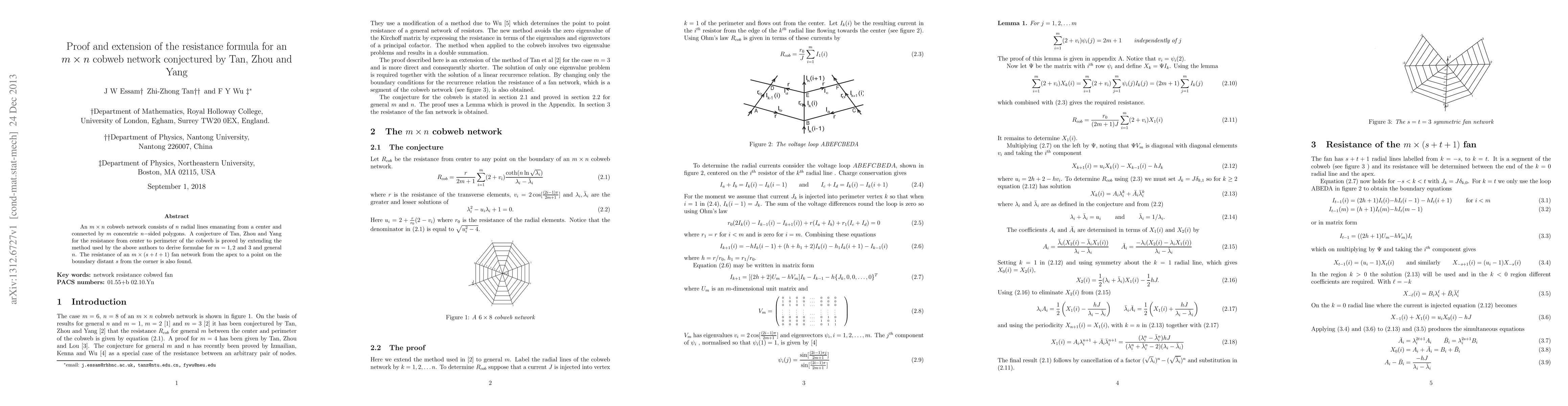 The paper proves a conjecture for the resistance from center to perimeter in an m x n cobweb network and extends it to general n and other fan networks.