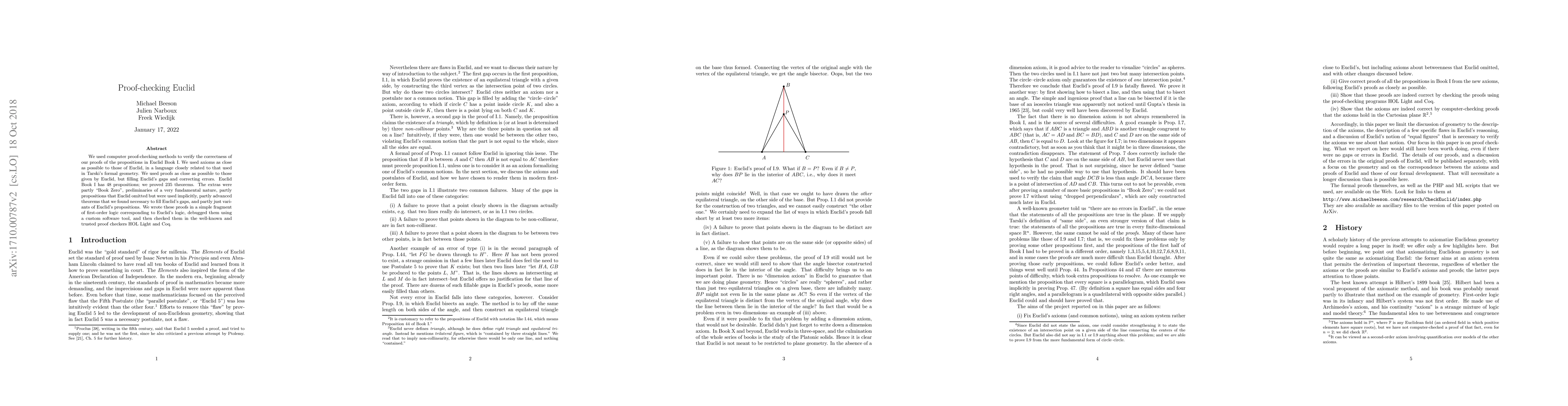 This paper verifies the correctness of proofs for 48 propositions in Euclid's Book I using computer proof-checking methods, filling gaps and correcting errors in Euclid's original proofs. The authors developed 235 theorems, including "Book Zero" preliminaries, implicit propositions, and advanced theorems to complete Euclid's logical framework, and verified them using HOL Light and Coq.