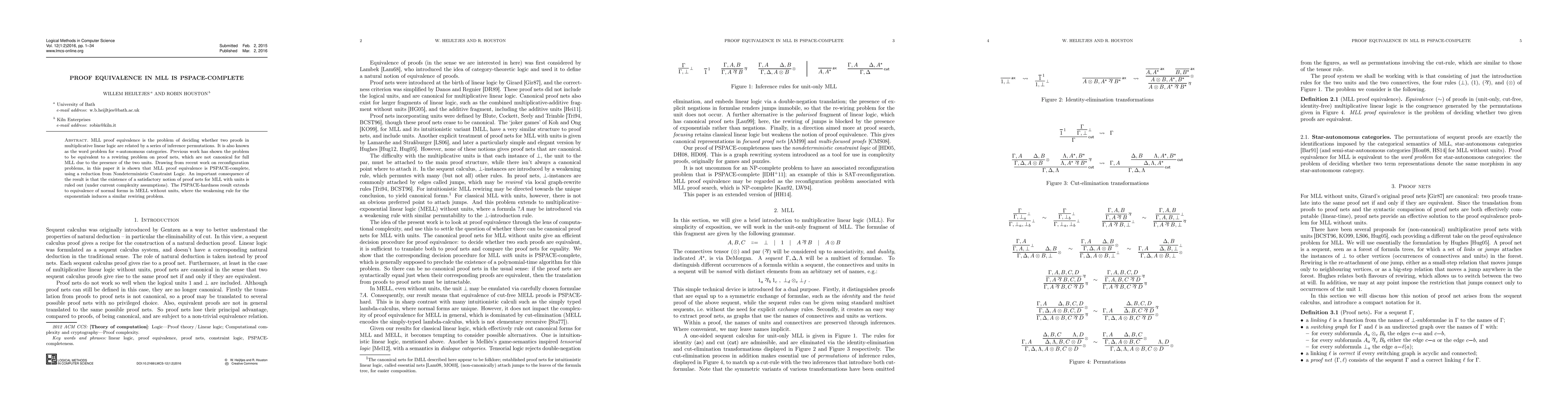 The paper establishes a PSPACE-completeness result for MLL proof equivalence via a reduction from Nondeterministic Constraint Logic, extending to normal forms in MELL without units.