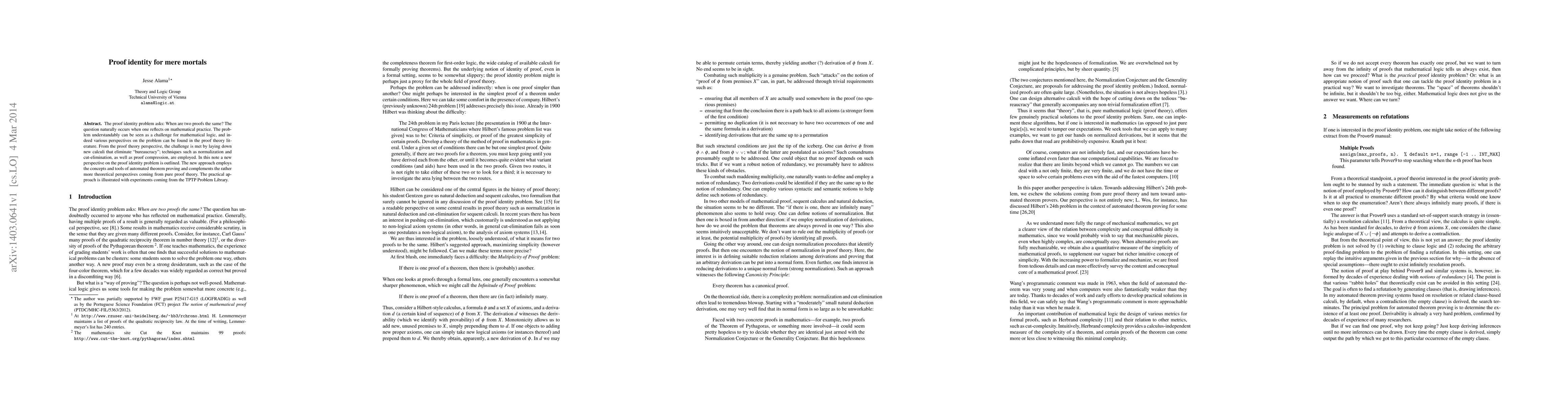 Researchers develop a new approach to solving the proof identity problem, using automated theorem proving techniques to compare mathematical proofs and identify identical ones. Their practical experiments on the TPTP Problem Library demonstrate the effectiveness of this method.