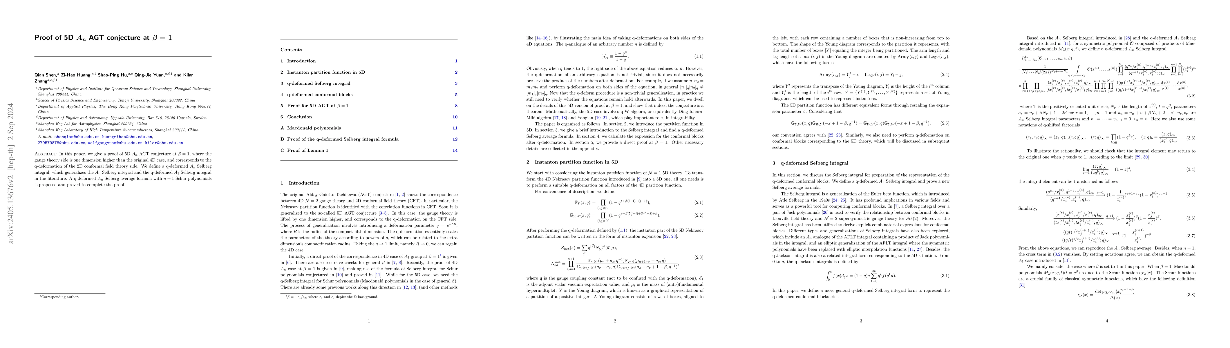 This paper proves the 5D $A_n$ AGT conjecture at $\beta=1$ by defining a q-deformed $A_n$ Selberg integral and proposing a corresponding q-deformed $A_n$ Selberg average formula with $n+1$ Schur polynomials. This extends the original 4D case to a higher-dimensional gauge theory.
