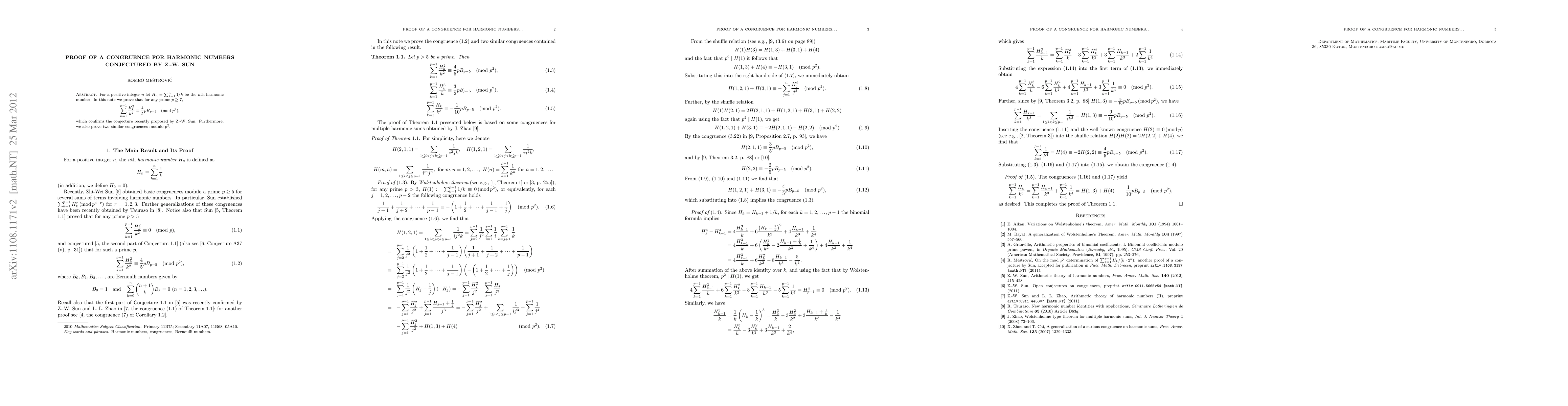The paper proves a congruence for harmonic numbers conjectured by Z.-W. Sun, confirming a relationship between harmonic numbers and Bernoulli numbers modulo p^2 for prime p >= 7.