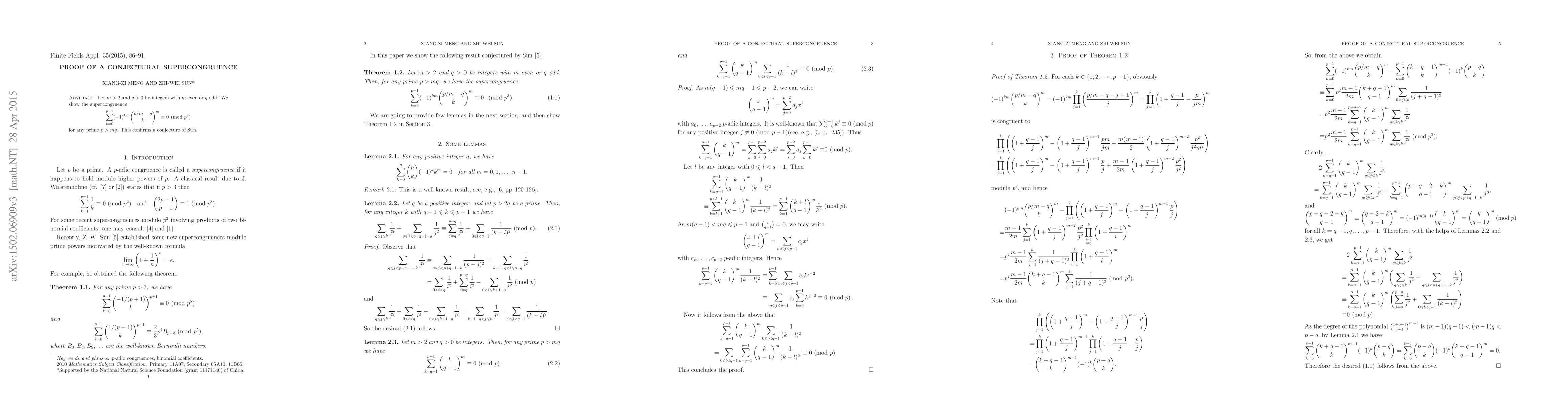 This paper proves a conjectural supercongruence for integers $m>2$ and $q>0$ with $m$ even or $q$ odd, showing that $$\sum_{k=0}^{p-1}(-1)^{km}\binom{p/m-q}{k}^m\equiv0\pmod{p^3}$$ for any prime $p>mq$. This confirms a conjecture proposed by Sun.