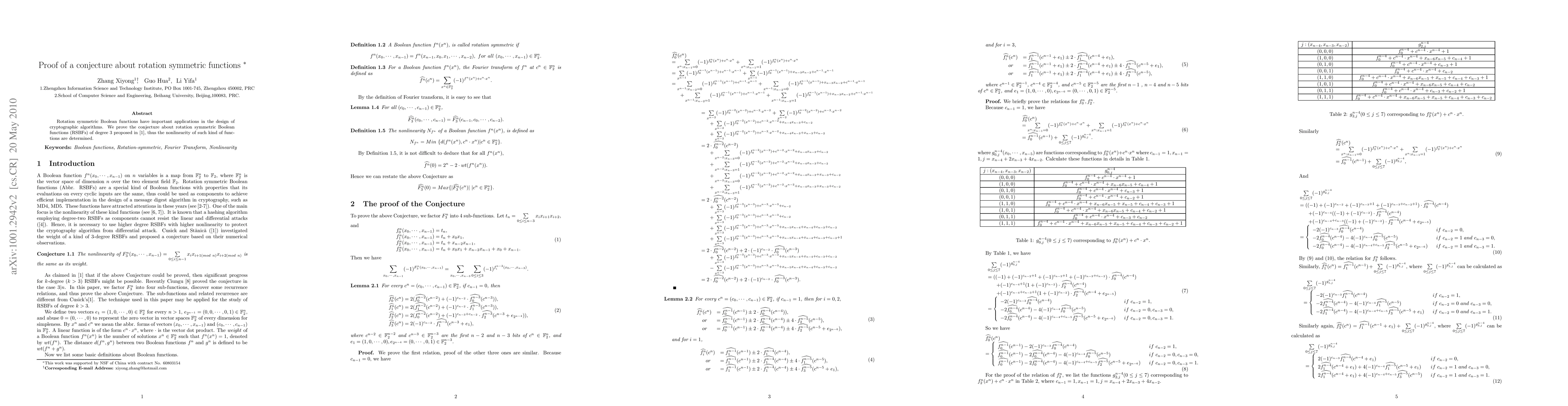 The paper proves a conjecture about rotation symmetric Boolean functions (RSBFs) of degree 3 using recurrence relations and mathematical induction.