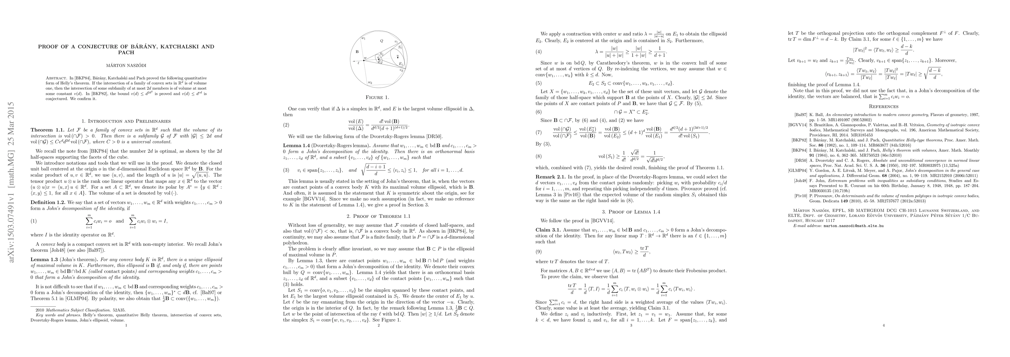 Researchers confirm Báry et al.'s conjecture on a quantitative form of Helly's theorem, proving that the intersection of some subfamily of at most $2d$ convex sets in $ extbb{R}^d$ is of volume at most $d^{cd}$.