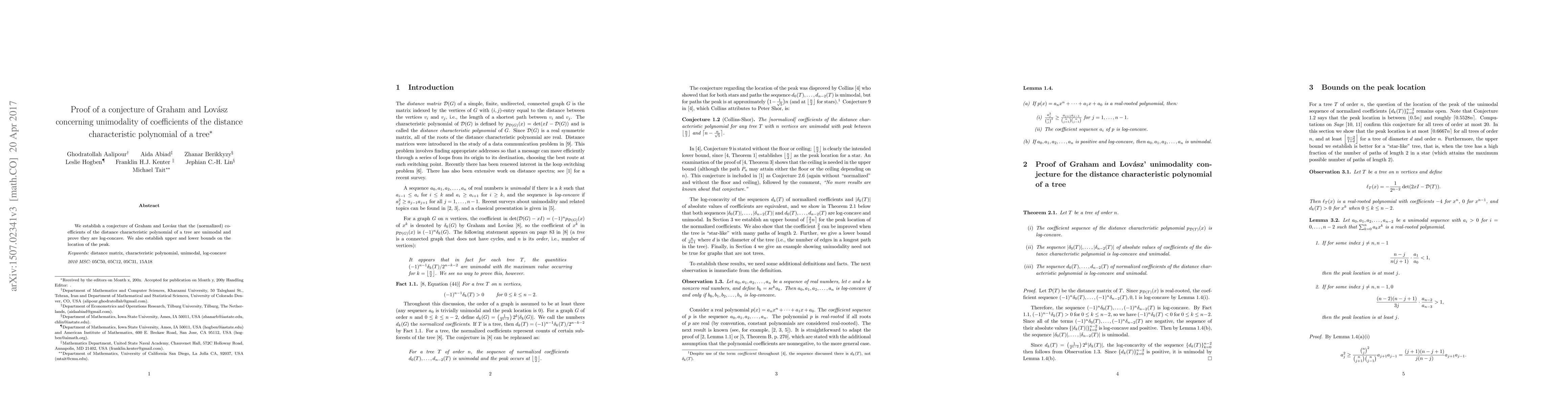 We establish a conjecture of Graham and Lov\'asz that the (normalized) coefficients of the distance characteristic polynomial of a tree are unimodal; we also prove they are log-concave.
