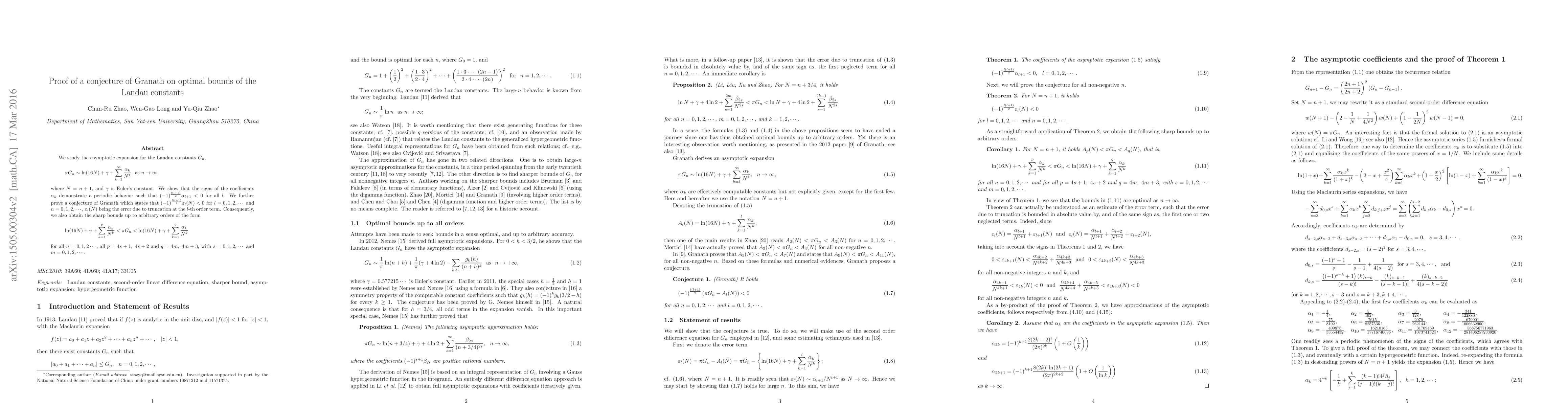 We study the asymptotic expansion for the Landau constants $G_n$, \begin{equation*} \pi G_{n}\sim \ln(16N)+\gamma+\sum^{\infty}_{k=1}\frac{\alpha_k}{N^k} ~~\mbox{as} ~ n\rightarrow\infty, \end{equation*} where $N=n+1$, and $\gamma$ is Euler's constant. We show that the signs of the coefficients $\alpha_{k}$ demonstrate a periodic behavior such that $(-1)^{\frac {l(l+1)} 2} \alpha_{l+1}< 0$ for all $l$. We further prove a conjecture of Granath which states that $(-1)^{\frac {l(l+1)} 2} \varepsilon_l(N)<0$ for $l=0,1,2,\cdots$ and $n=0,1,2,\cdots$, $\varepsilon_l(N)$ being the error due to truncation at the $l$-th order term. Consequently, we also obtain the sharp bounds up to arbitrary orders of the form \begin{equation*} \ln(16N)+\gamma+\sum_{k=1}^{p}\frac{\alpha_{k}}{N^{k}}<\pi G_{n}<\ln(16N)+\gamma+\sum_{k=1}^{q}\frac{\alpha_{k}}{N^{k}} \end{equation*} for all $n=0,1,2\cdots$, all $p=4s+1,\; 4s+2$ and $q=4m,\; 4m+3$, with $s=0,1,2,\cdots$ and $m=0, 1, 2,\cdots$.