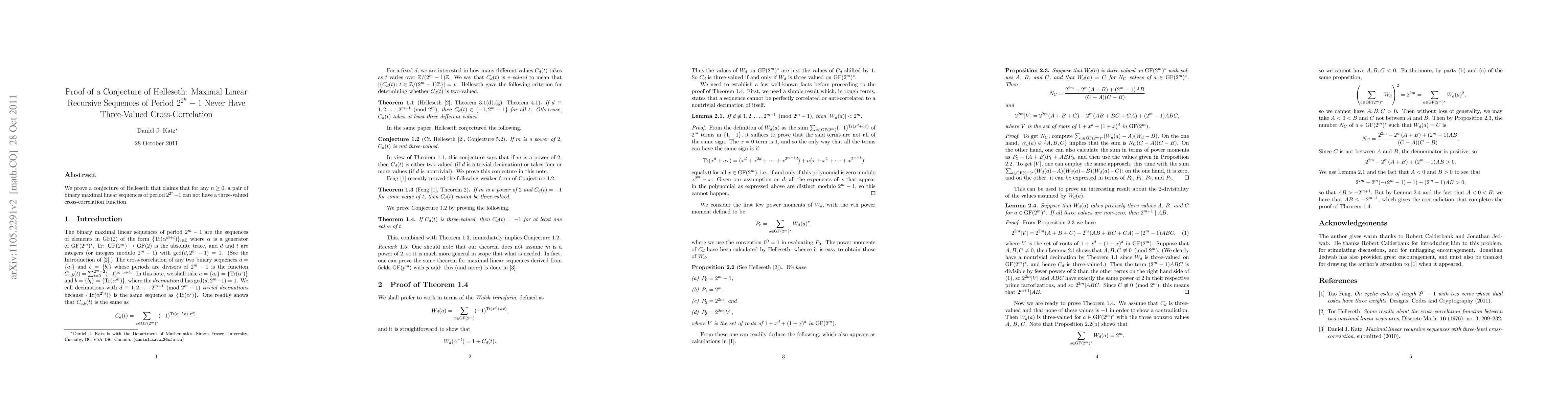 We prove a conjecture of Helleseth that claims that for any $n \geq 0$, a pair of binary maximal linear sequences of period $2^{2^n}-1$ can not have a three-valued cross-correlation function.