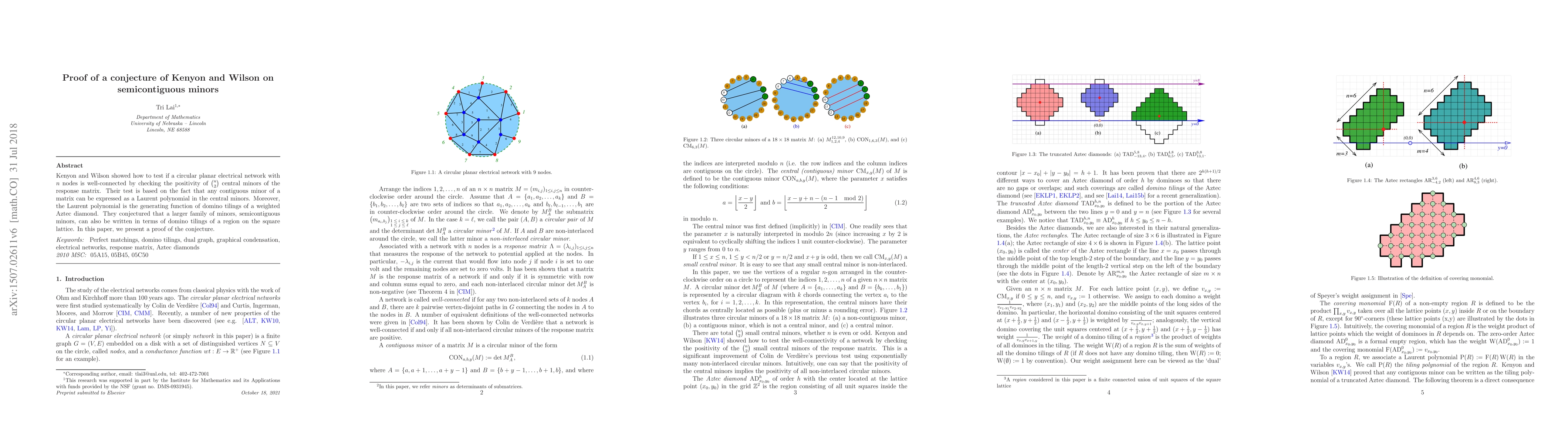 Kenyon and Wilson showed how to test if a circular planar electrical network with $n$ nodes is well-connected by checking the positivity of $\binom{n}{2}$ central minors of the response matrix. Their test is based on the fact that any contiguous minor of a matrix can be expressed as a Laurent polynomial in the central minors. Moreover, the Laurent polynomial is the generating function of domino tilings of a weighted Aztec diamond. They conjectured that a larger family of minors, semicontiguous minors, can also be written in terms of domino tilings of a region on the square lattice. In this paper, we present a proof of the conjecture.
