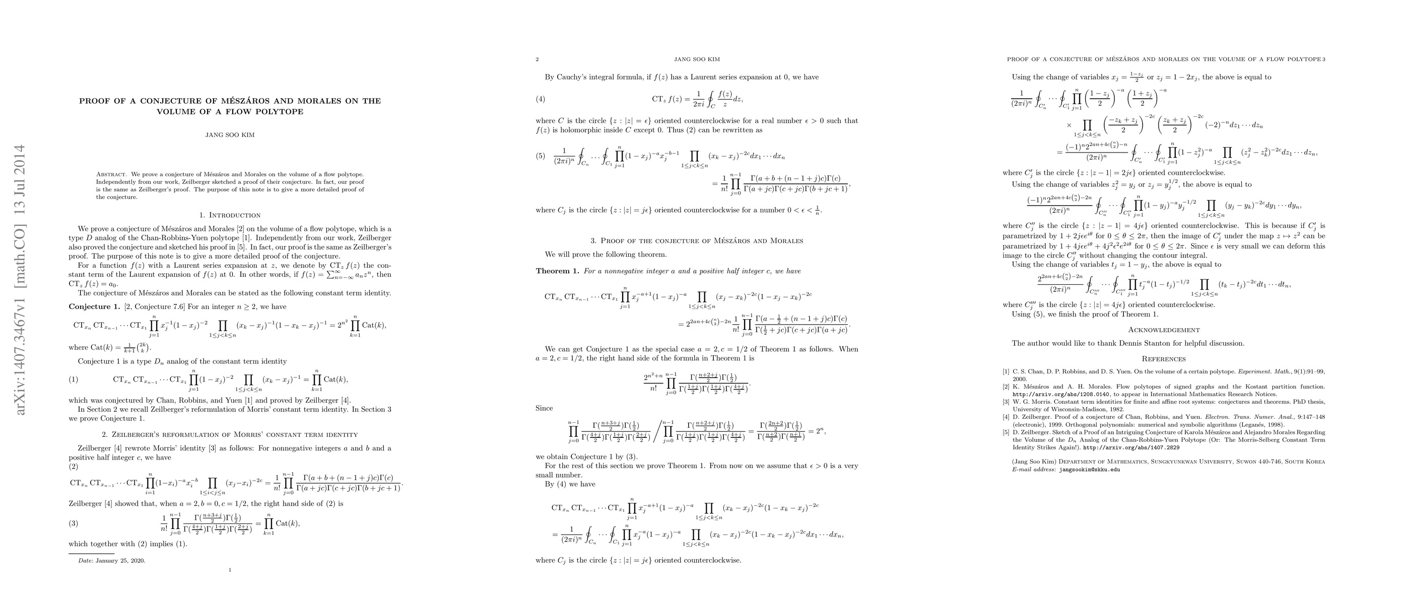 This paper provides a detailed proof of a conjecture by Meszaros and Morales regarding the volume of a flow polytope, confirming the same result independently sketched by Zeilberger. The authors aim to present a more thorough version of Zeilberger's proof.