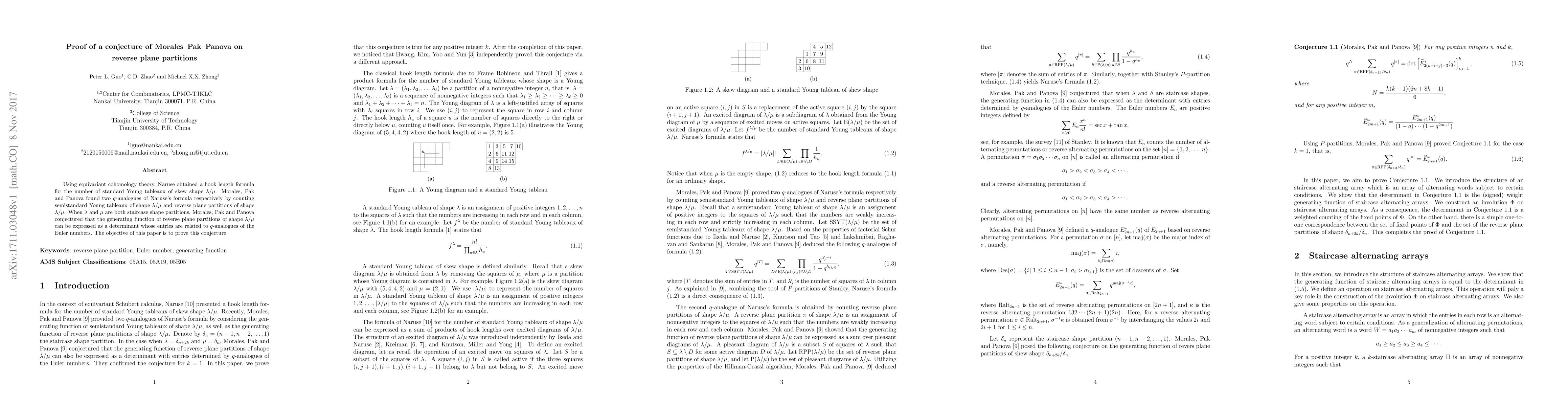 Using equivariant cohomology theory, Naruse obtained a hook length formula for the number of standard Young tableaux of skew shape $\lambda/\mu$. Morales, Pak and Panova found two $q$-analogues of Naruse's formula respectively by counting semistandard Young tableaux of shape $\lambda/\mu$ and reverse plane partitions of shape $\lambda/\mu$. When $\lambda$ and $\mu$ are both staircase shape partitions, Morales, Pak and Panova conjectured that the generating function of reverse plane partitions of shape $\lambda/ \mu$ can be expressed as a determinant whose entries are related to $q$-analogues of the Euler numbers. The objective of this paper is to prove this conjecture.
