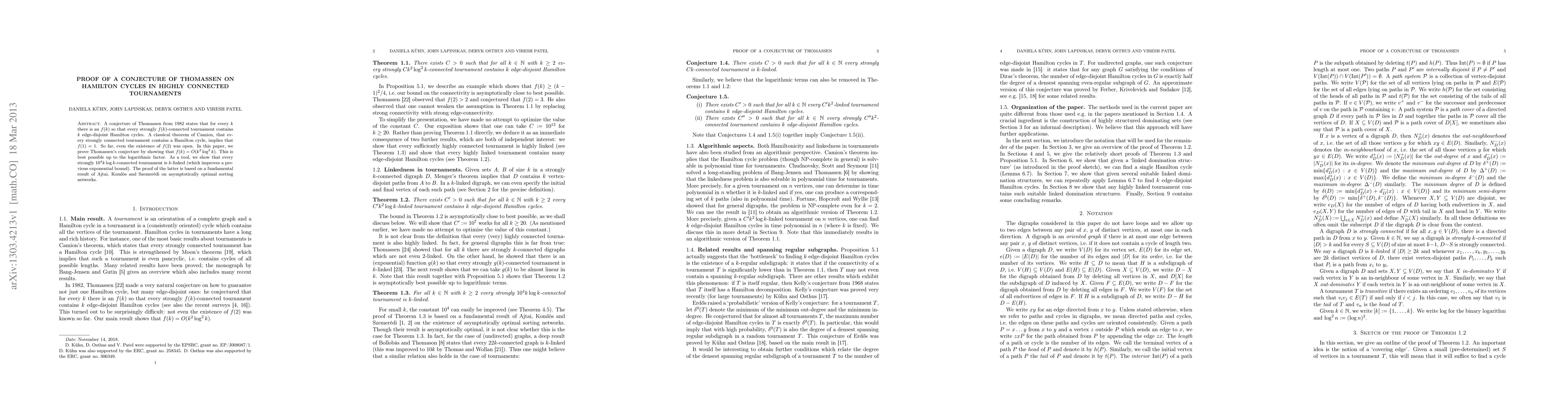 Researchers prove Thomassen's conjecture that every strongly f(k)-connected tournament contains k edge-disjoint Hamilton cycles for f(k)=O(k^2*log^2(k)), a breakthrough that improves previous bounds on the existence of such tournaments.