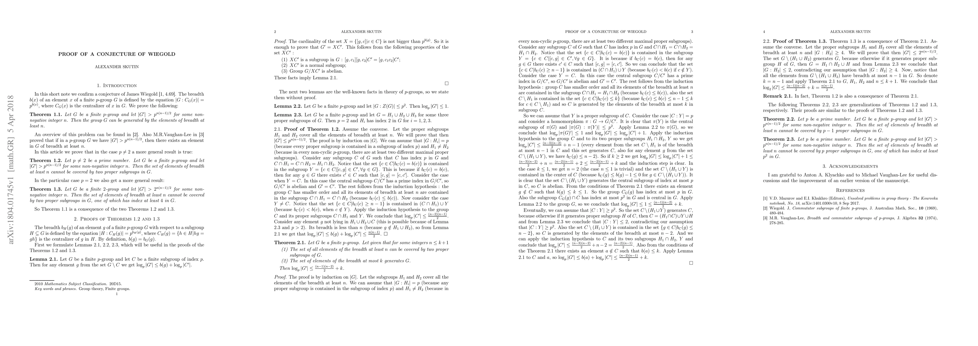 In this short note we confirm a conjecture of James Wiegold. We prove that if $G$ is a finite $p$-group and $|G'|>p^{n(n-1)/2}$ for some non-negative integer $n$, then the group $G$ can be generated by the elements of breadth at least $n$. The breadth $b(x)$ of an element $x$ of a finite $p$-group $G$ is defined by the equation $|G:C_G(x)| = p^{b(x)}$, where $C_G(x)$ is the centralizer of $x$ in $G$.