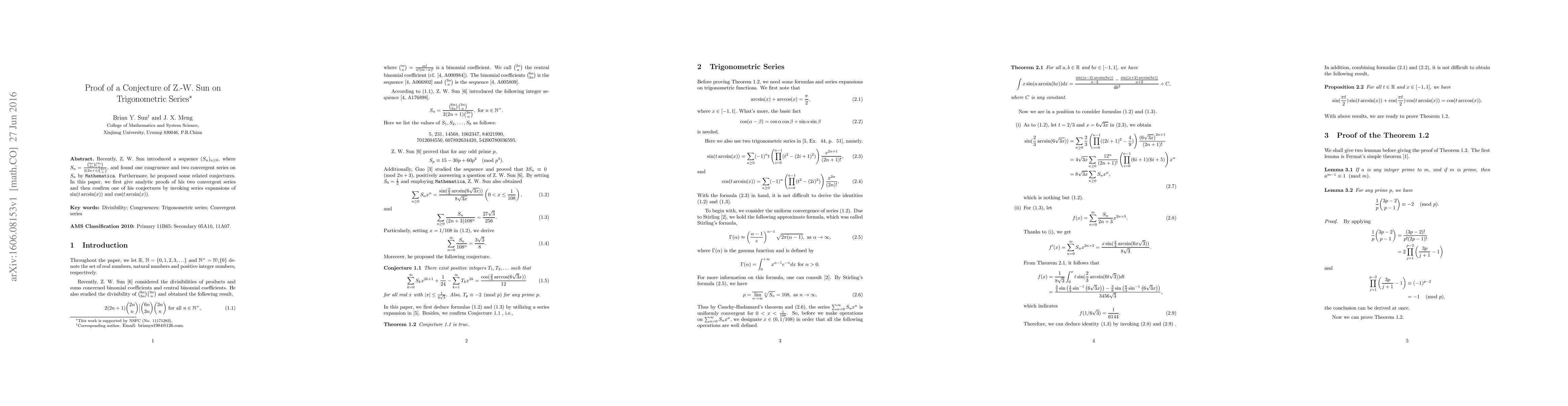 Recently, Z. W. Sun introduced a sequence $(S_n)_{n\geq 0}$, where $S_n=\frac{\binom{6n}{3n} \binom{3n}{n}}{2(2n+1)\binom{2n}{n}}$, and found one congruence and two convergent series on $S_n$ by {\tt{Mathematica}}. Furthermore, he proposed some related conjectures. In this paper, we first give analytic proofs of his two convergent series and then confirm one of his conjectures by invoking series expansions of $\sin(t\arcsin(x))$ and $\cos(t\arcsin(x)).$