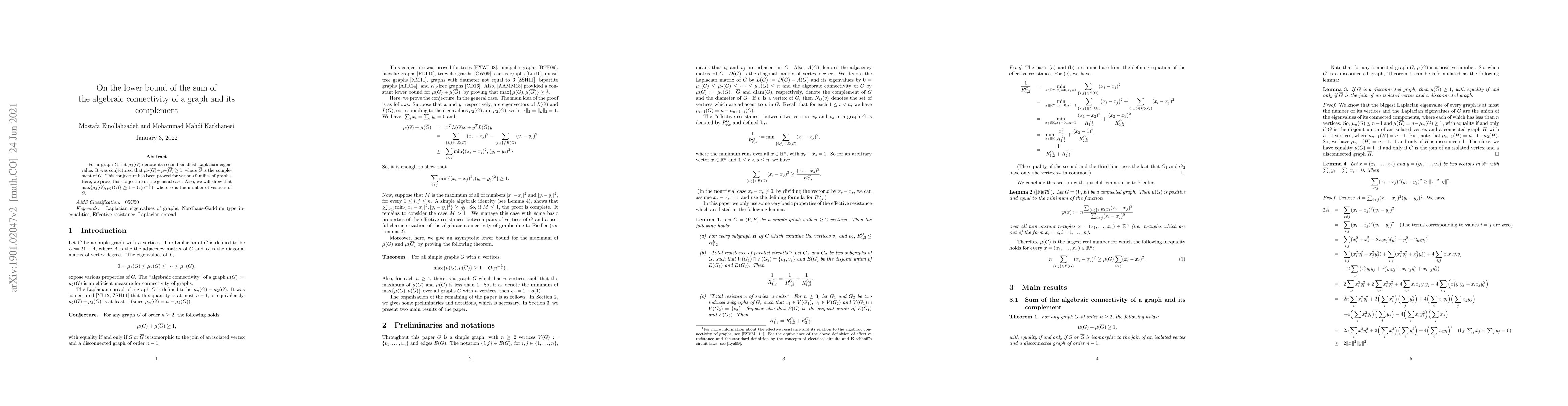 For a graph $G$, let $\lambda_2(G)$ denote its second smallest Laplacian eigenvalue. It was conjectured that $\lambda_2(G) + \lambda_2(\overline{G}) \geq 1$, where $\bar{G}$ is the complement of $G$. Here, we prove this conjecture in the general case. Also, we will show that $\max\{\lambda_2(G), \lambda_2(\overline{G})\} \geq 1 - O(n^{-\frac 13})$, where $n$ is the number of vertices of $G$.