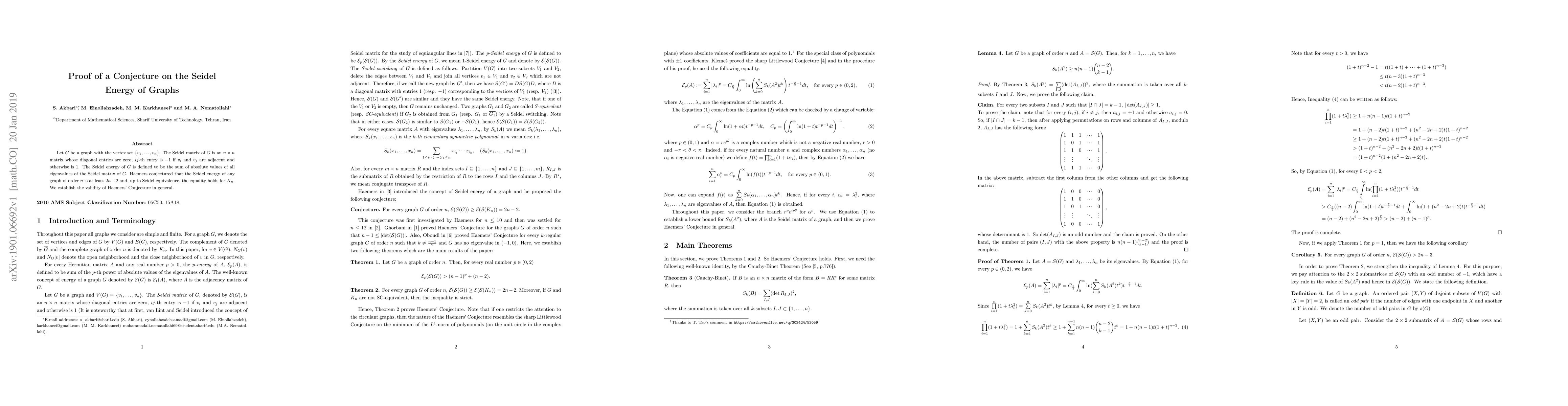 The paper provides a proof for Haemers' Conjecture on the Seidel energy of graphs using lemmas and theorems, involving detailed analysis of Seidel matrices and their eigenvalues.