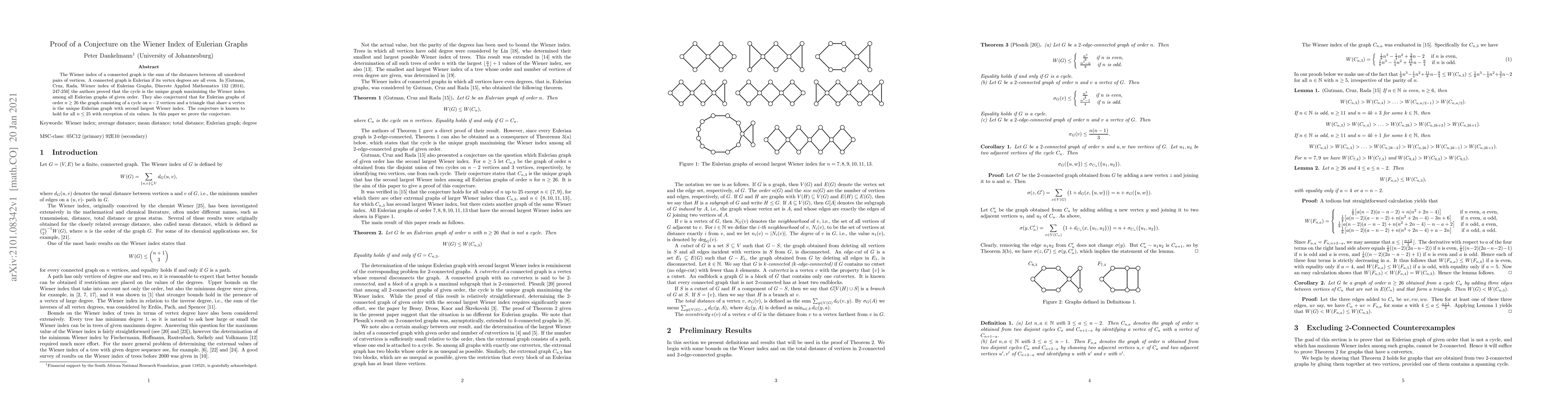 This paper proves a conjecture regarding the Wiener index of Eulerian graphs, confirming that for Eulerian graphs with order $n \geq 26$, the graph consisting of a cycle on $n-2$ vertices and a triangle sharing a vertex is the unique graph with the second largest Wiener index. This resolves an exception for six values previously noted for smaller $n$.