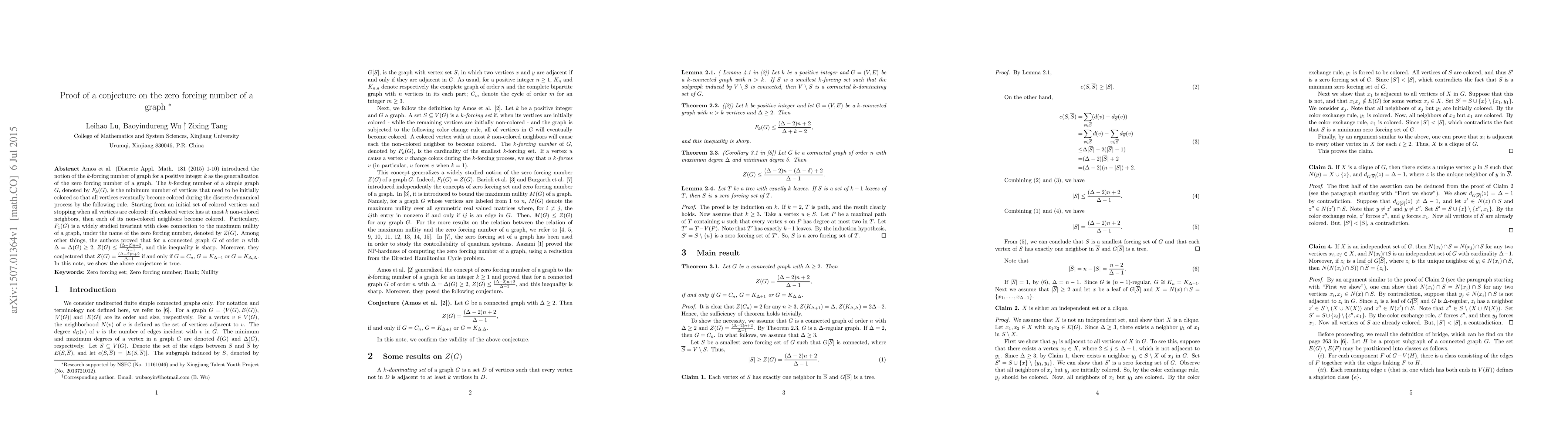The research paper proves a conjecture on the zero forcing number of graphs, showing that it equals β(Χ-2)n+2/Χ-1 for specific types of graphs, including cycles, complete graphs, and bipartite graphs with certain properties.