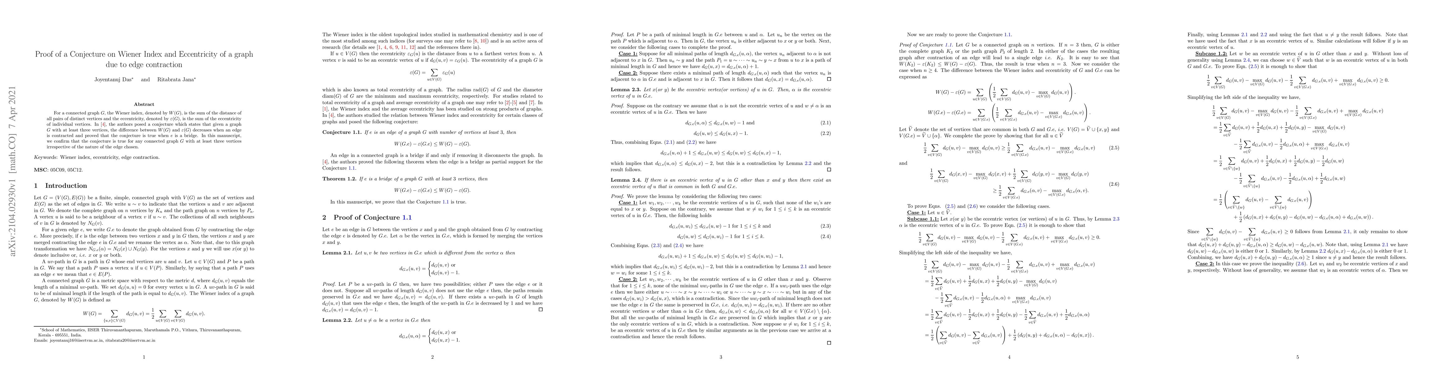 This paper confirms a conjecture regarding the Wiener index and eccentricity of a graph, proving that the difference between these two metrics decreases when any edge is contracted, regardless of the edge's nature, in any connected graph with at least three vertices. This extends previous results that only applied to bridge edges.