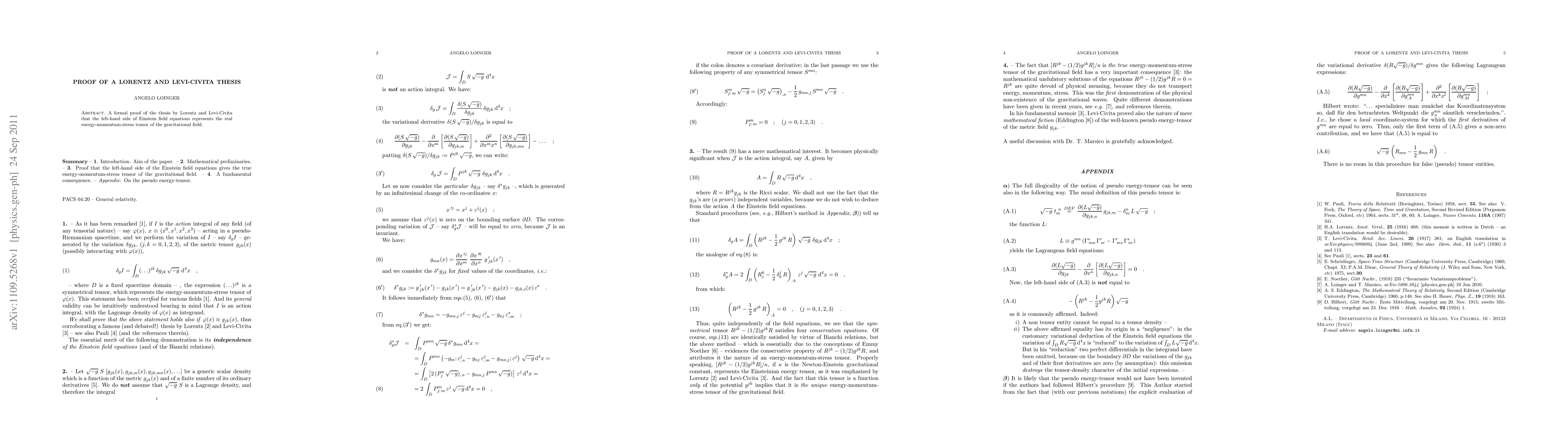 Summary: This paper provides a formal proof supporting the Lorentz and Levi-Civita thesis that the left-hand side of Einstein's field equations accurately represents the energy-momentum-stress tensor of the gravitational field, thereby reinforcing the theoretical framework of general relativity.