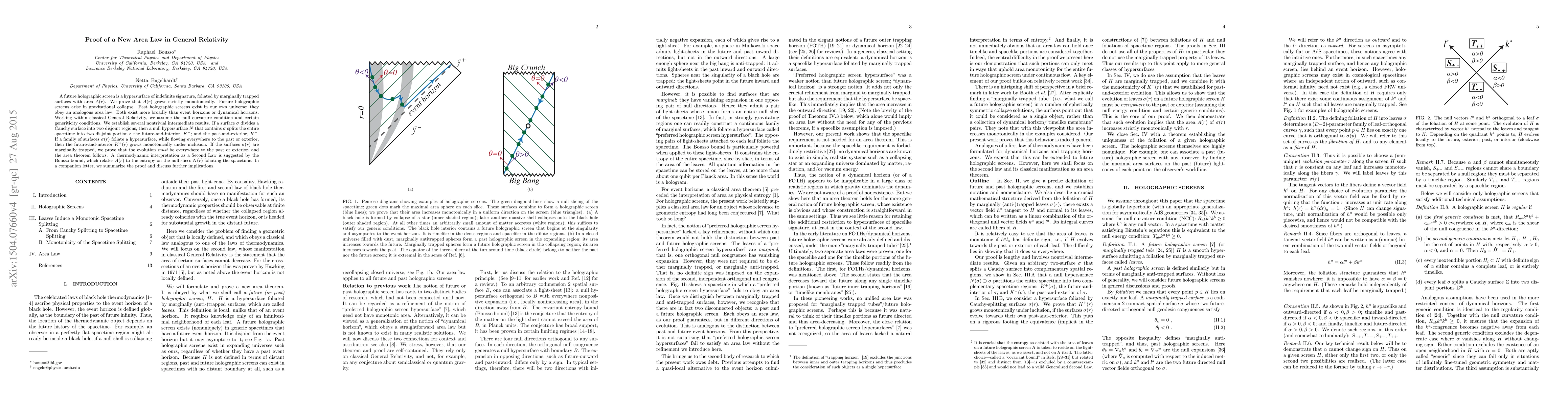 A future holographic screen is a hypersurface of indefinite signature, foliated by marginally trapped surfaces with area $A(r)$. We prove that $A(r)$ grows strictly monotonically. Future holographic screens arise in gravitational collapse. Past holographic screens exist in our own universe; they obey an analogous area law. Both exist more broadly than event horizons or dynamical horizons. Working within classical General Relativity, we assume the null curvature condition and certain generiticity conditions. We establish several nontrivial intermediate results. If a surface $\sigma$ divides a Cauchy surface into two disjoint regions, then a null hypersurface $N$ that contains $\sigma$ splits the entire spacetime into two disjoint portions: the future-and-interior, $K^+$; and the past-and-exterior, $K^-$. If a family of surfaces $\sigma(r)$ foliate a hypersurface, while flowing everywhere to the past or exterior, then the future-and-interior $K^+(r)$ grows monotonically under inclusion. If the surfaces $\sigma(r)$ are marginally trapped, we prove that the evolution must be everywhere to the past or exterior, and the area theorem follows. A thermodynamic interpretation as a Second Law is suggested by the Bousso bound, which relates $A(r)$ to the entropy on the null slices $N(r)$ foliating the spacetime. In a companion letter, we summarize the proof and discuss further implications.