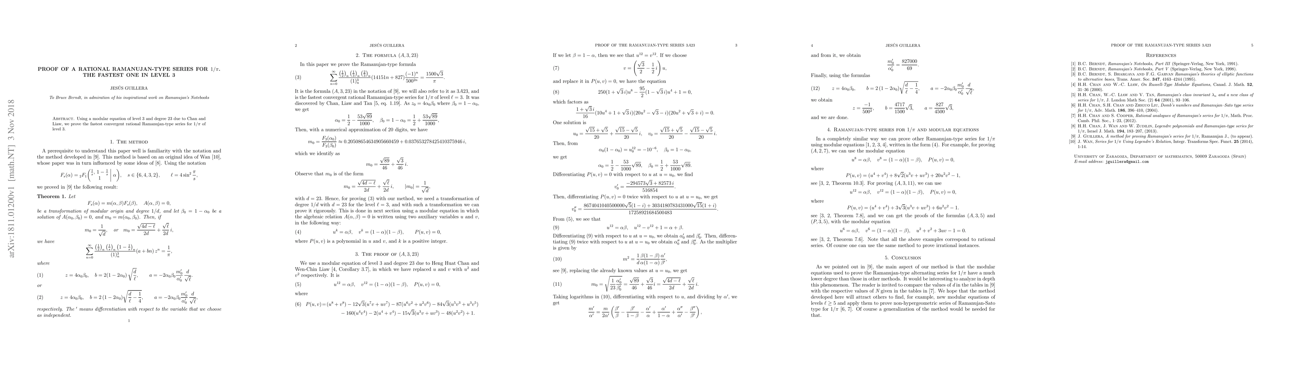 Summary: This paper proves the fastest converging rational Ramanujan-type series for \(1/\pi\) at level 3 using a modular equation of level 3 and degree 23 by Chan and Liaw. The series provides an efficient method for computing \(\pi\).