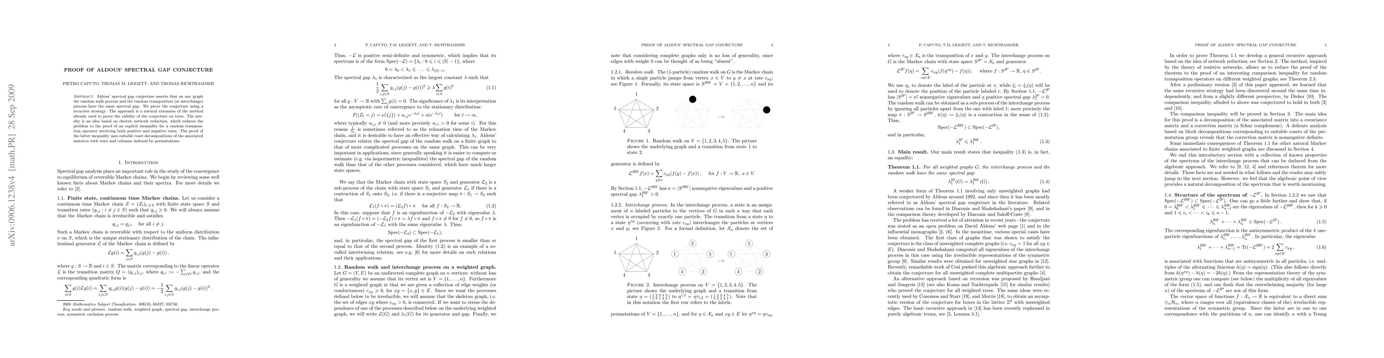 This paper proves Aldous' spectral gap conjecture by demonstrating that the random walk and random transposition processes share the same spectral gap on any graph. The proof employs a recursive strategy and introduces an innovative electric network reduction technique to establish an explicit inequality for a random transposition operator.