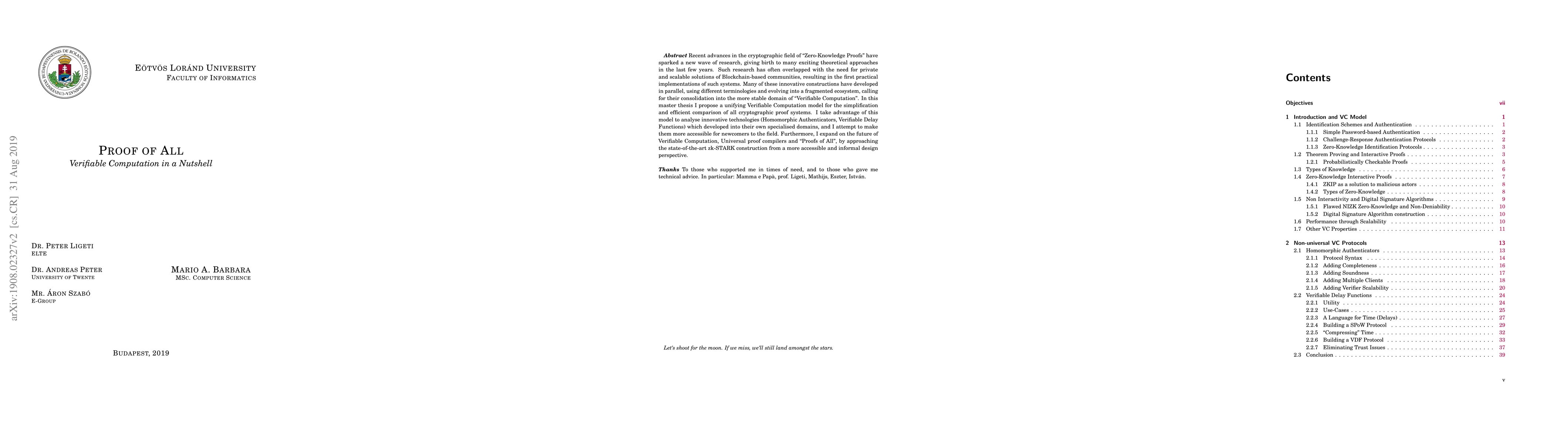Recent advances in the cryptographic field of "Zero-Knowledge Proofs" have sparked a new wave of research, giving birth to many exciting theoretical approaches in the last few years. Such research has often overlapped with the need for private and scalable solutions of Blockchain-based communities, resulting in the first practical implementations of such systems. Many of these innovative constructions have developed in parallel, using different terminologies and evolving into a fragmented ecosystem, calling for their consolidation into the more stable domain of "Verifiable Computation". In this master thesis I propose a unifying Verifiable Computation model for the simplification and efficient comparison of all cryptographic proof systems. I take advantage of this model to analyse innovative technologies (Homomorphic Authenticators, Verifiable Delay Functions) which developed into their own specialised domains, and I attempt to make them more accessible for newcomers to the field. Furthermore, I expand on the future of Verifiable Computation, Universal proof compilers and "Proofs of All", by approaching the state-of-the-art zk-STARK construction from a more accessible and informal design perspective.