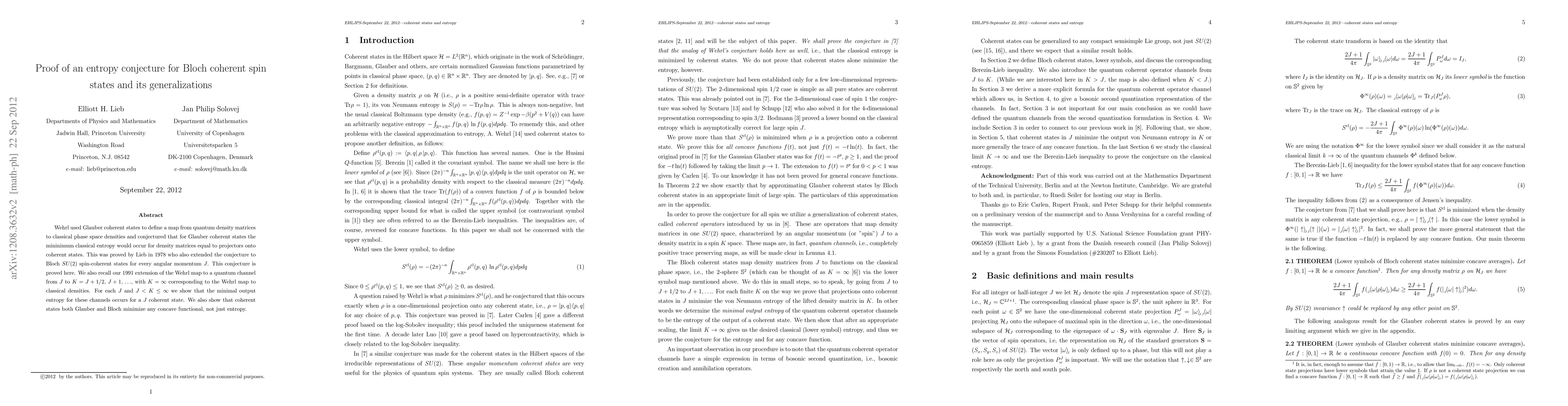This paper proves a conjecture about entropy in quantum systems using Bloch coherent spin states, extending earlier work on Glauber coherent states. It shows that minimal output entropy occurs for a specific type of state, with implications for understanding quantum information processing.