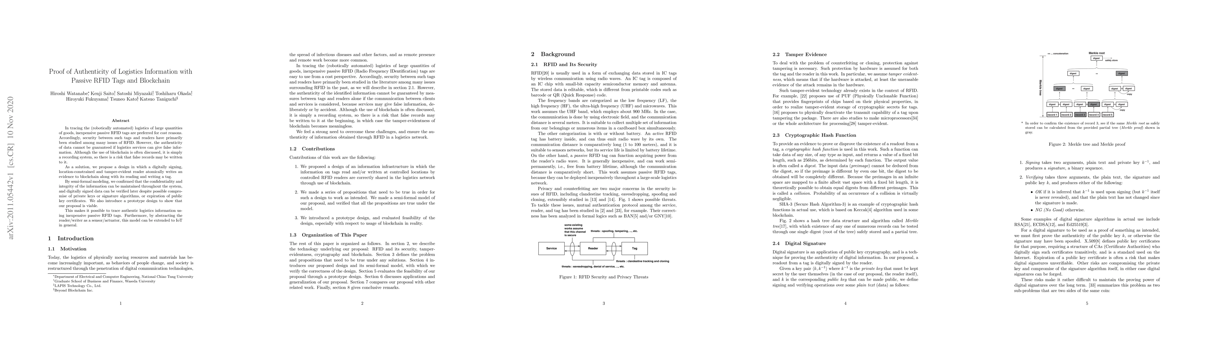 In tracing the (robotically automated) logistics of large quantities of goods, inexpensive passive RFID tags are preferred for cost reasons. Accordingly, security between such tags and readers have primarily been studied among many issues of RFID. However, the authenticity of data cannot be guaranteed if logistics services can give false information. Although the use of blockchain is often discussed, it is simply a recording system, so there is a risk that false records may be written to it. As a solution, we propose a design in which a digitally signing, location-constrained and tamper-evident reader atomically writes an evidence to blockchain along with its reading and writing a tag. By semi-formal modeling, we confirmed that the confidentiality and integrity of the information can be maintained throughout the system, and digitally signed data can be verified later despite possible compromise of private keys or signature algorithms, or expiration of public key certificates. We also introduce a prototype design to show that our proposal is viable. This makes it possible to trace authentic logistics information using inexpensive passive RFID tags. Furthermore, by abstracting the reader/writer as a sensor/actuator, this model can be extended to IoT in general.