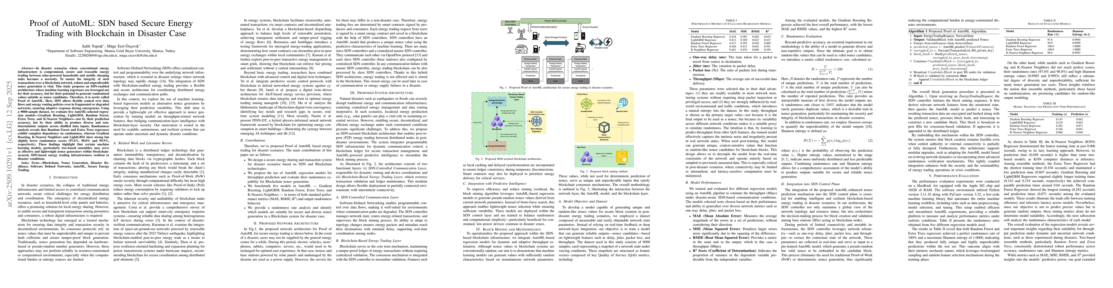 In disaster scenarios where conventional energy infrastructure is compromised, secure and traceable energy trading between solar-powered households and mobile charging units becomes a necessity. To ensure the integrity of such transactions over a blockchain network, robust and unpredictable nonce generation is vital. This study proposes an SDN-enabled architecture where machine learning regressors are leveraged not for their accuracy, but for their potential to generate randomized values suitable as nonce candidates. Therefore, it is newly called Proof of AutoML. Here, SDN allows flexible control over data flows and energy routing policies even in fragmented or degraded networks, ensuring adaptive response during emergencies. Using a 9000-sample dataset, we evaluate five AutoML-selected regression models - Gradient Boosting, LightGBM, Random Forest, Extra Trees, and K-Nearest Neighbors - not by their prediction accuracy, but by their ability to produce diverse and non-deterministic outputs across shuffled data inputs. Randomness analysis reveals that Random Forest and Extra Trees regressors exhibit complete dependency on randomness, whereas Gradient Boosting, K-Nearest Neighbors and LightGBM show strong but slightly lower randomness scores (97.6%, 98.8% and 99.9%, respectively). These findings highlight that certain machine learning models, particularly tree-based ensembles, may serve as effective and lightweight nonce generators within blockchain-secured, SDN-based energy trading infrastructures resilient to disaster conditions.