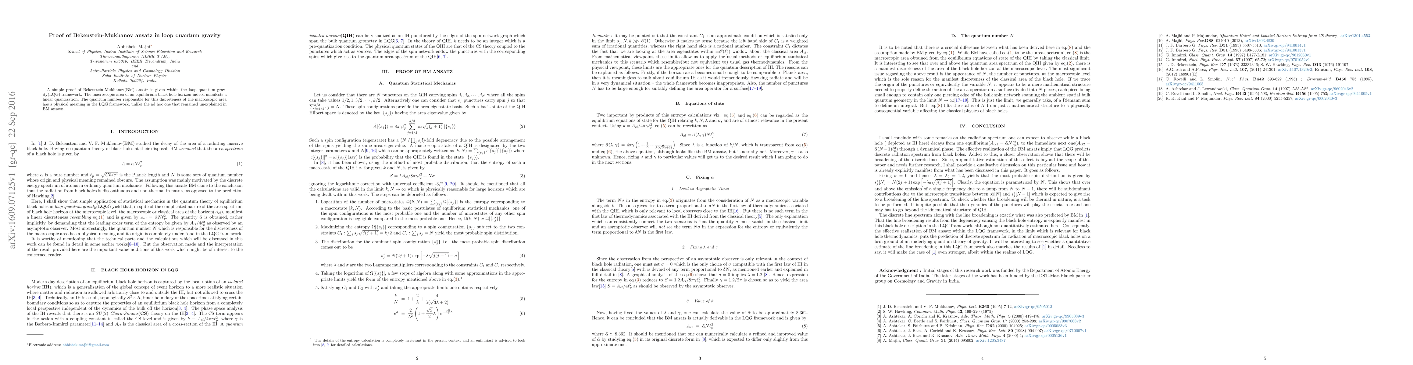 A simple proof of Bekenstein-Mukhanov(BM) ansatz is given within the loop quantum gravity(LQG) framework. The macroscopic area of an equilibrium black hole horizon indeed manifests a linear quantization. The quantum number responsible for this discreteness of the macroscopic area has a physical meaning in the LQG framework, unlike the ad hoc one that remained unexplained in BM ansatz.