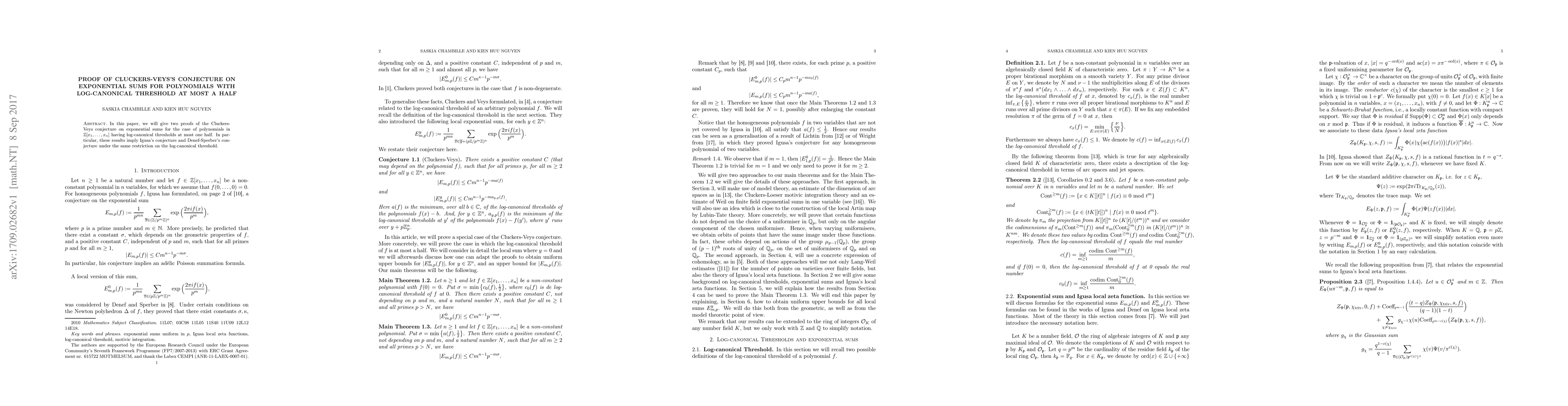 The paper presents two proofs of the Cluckers-Veys conjecture regarding exponential sums for polynomials in $\mathbb{Z}[x_{1},\ldots,x_{n}]$ with log-canonical thresholds no greater than one half, also confirming Igusa's and Denef-Sperber's conjectures under the same threshold restriction.