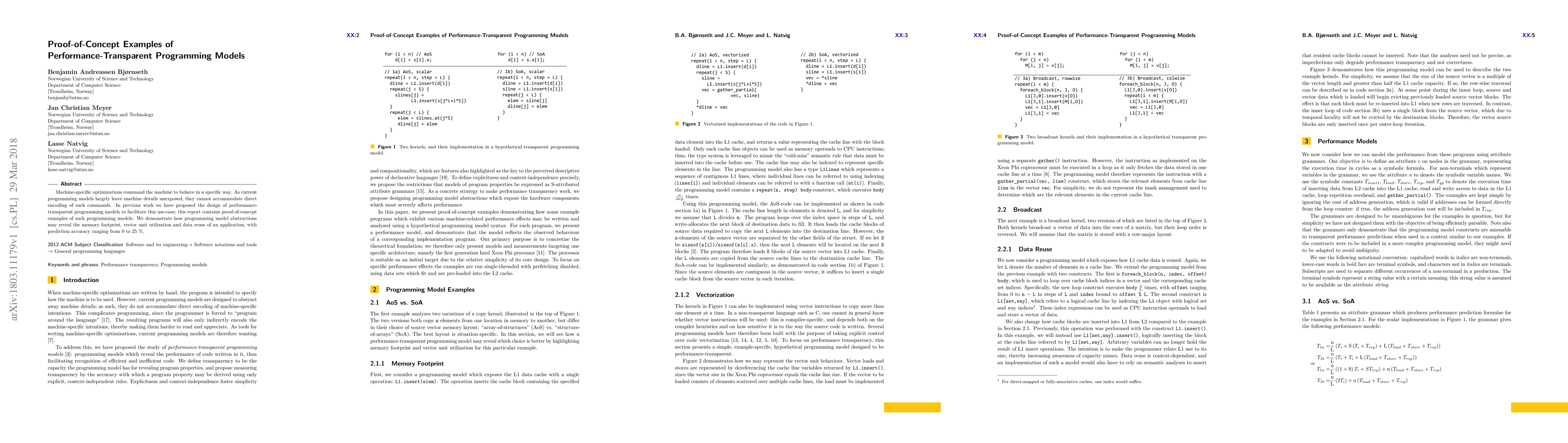 Machine-specific optimizations command the machine to behave in a specific way. As current programming models largely leave machine details unexposed, they cannot accommodate direct encoding of such commands. In previous work we have proposed the design of performance-transparent programming models to facilitate this use-case; this report contains proof-of-concept examples of such programming models. We demonstrate how programming model abstractions may reveal the memory footprint, vector unit utilization and data reuse of an application, with prediction accuracy ranging from 0 to 25 \%.