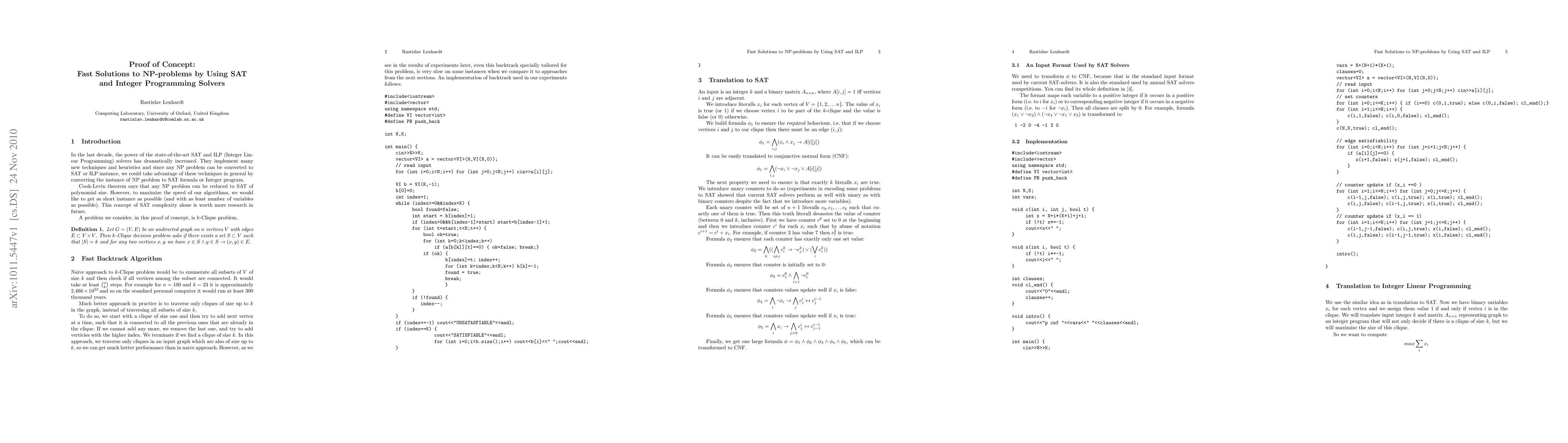 This paper demonstrates that translating NP-hard problems like finding the largest clique in a graph into SAT or Integer Programming instances can leverage advanced solvers, with the Integer Programming approach proving to be the fastest among the tested methods. Experiments on large random graphs showed significant improvements over traditional backtrack solutions.