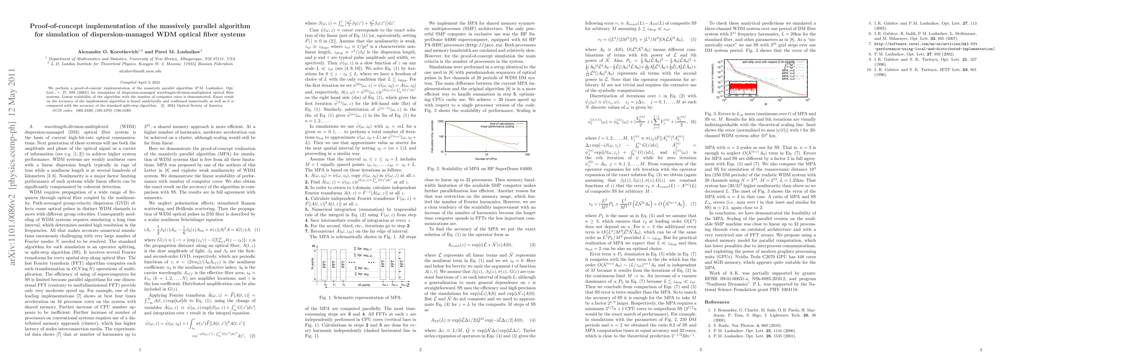 This paper presents a proof-of-concept implementation of a massively parallel algorithm for simulating dispersion-managed wavelength-division-multiplexed optical fiber systems, demonstrating linear scalability with computer cores. The implemented algorithm's accuracy is analytically derived and confirmed numerically, showing better performance compared to the standard split-step algorithm.
