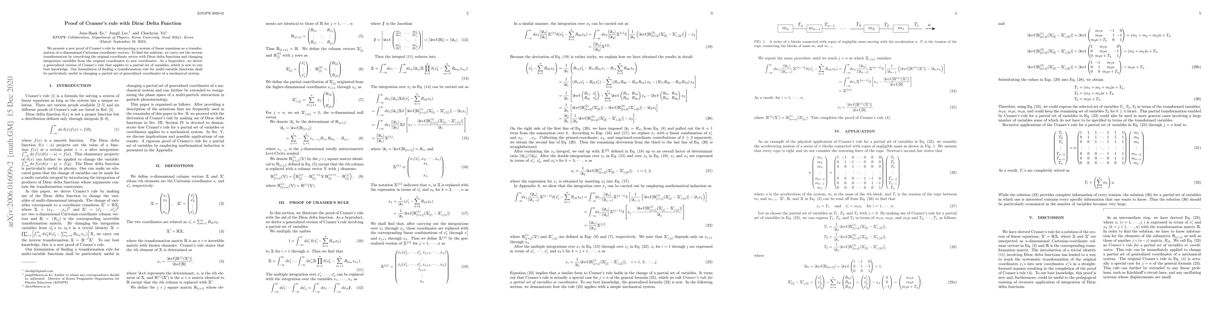 This paper provides a novel proof of Cramer's rule by using Dirac delta functions to transform and solve a system of linear equations. It also introduces a generalized version applicable to partial sets of variables, useful for changing generalized coordinates in mechanical systems.