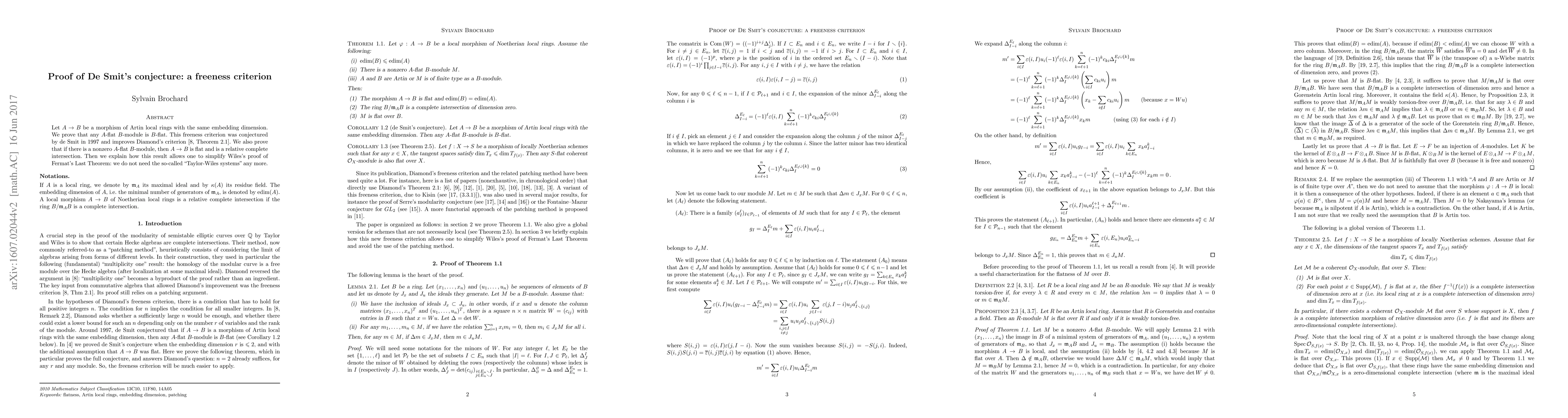 Let $A\to B$ be a morphism of Artin local rings with the same embedding dimension. We prove that any $A$-flat $B$-module is $B$-flat. This freeness criterion was conjectured by de Smit in 1997 and improves Diamond's Theorem 2.1 from his 1997 paper "The Taylor-Wiles construction and multiplicity one". We also prove that if there is a nonzero $A$-flat $B$-module, then $A\to B$ is flat and is a relative complete intersection (i.e. $B/\mathfrak{m}_AB$ is a complete intersection). Then we explain how this result allows to simplify Wiles's proof of Fermat's Last Theorem: we do not need the so-called "Taylor-Wiles systems" anymore.
