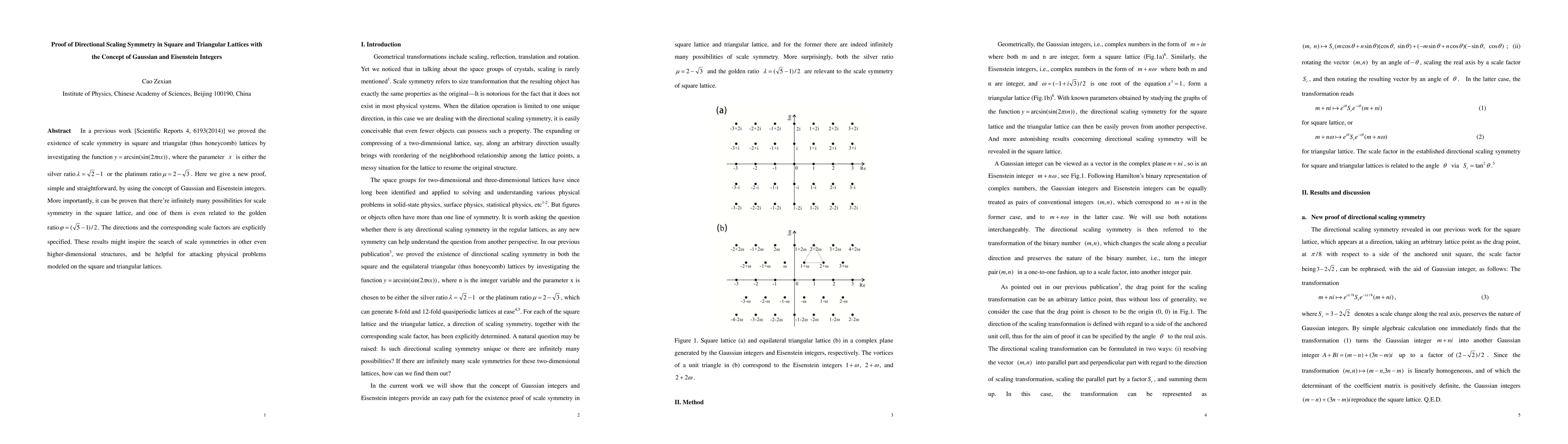 In a previous work [Scientific Reports 4, 6193(2014)] we proved the existence of scale symmetry in square and triangular (thus honeycomb) lattices by investigating the functiony=\arcsin(\sin(2\pinx)), where the parameter is either the silver ratio\lambda=\sqrt{2}-1 or the platinum ratio\mu=2-\sqrt{3}. Here we give a new proof, simple and straightforward, by using the concept of Gaussian and Eisenstein integers. More importantly, it can be proven that there are infinitely many possibilities for scale symmetry in the square lattice, and one of them is even related to the golden ratio\varphi=(\sqrt{5}-1)/2 . The directions and the corresponding scale factors are explicitly specified. These results might inspire the search of scale symmetries in other even higher-dimensional structures, and be helpful for attacking physical problems modeled on the square and triangular lattices.