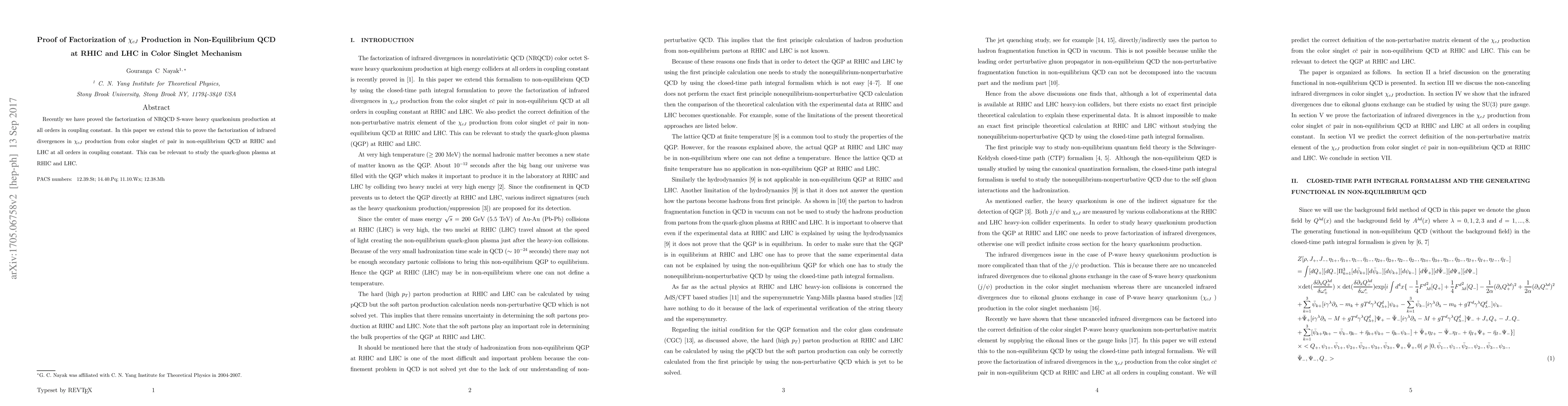 This paper proves the factorization of infrared divergences in $\chi_{cJ}$ production from color singlet $c{\bar c}$ pairs in non-equilibrium QCD at RHIC and LHC, extending previous results for NRQCD S-wave heavy quarkonium production. This finding is significant for studying the quark-gluon plasma in these environments.