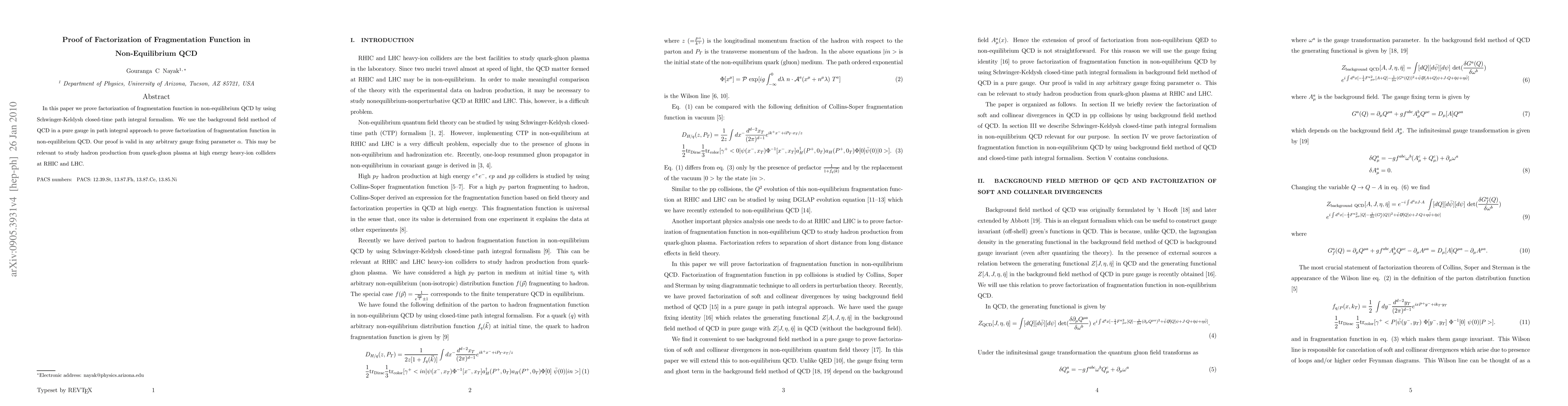 This paper proves the factorization of the fragmentation function in non-equilibrium QCD using the Schwinger-Keldysh formalism and the background field method, valid for any gauge fixing parameter $\alpha$. This result is significant for studying hadron production in high-energy heavy-ion collisions at RHIC and LHC.
