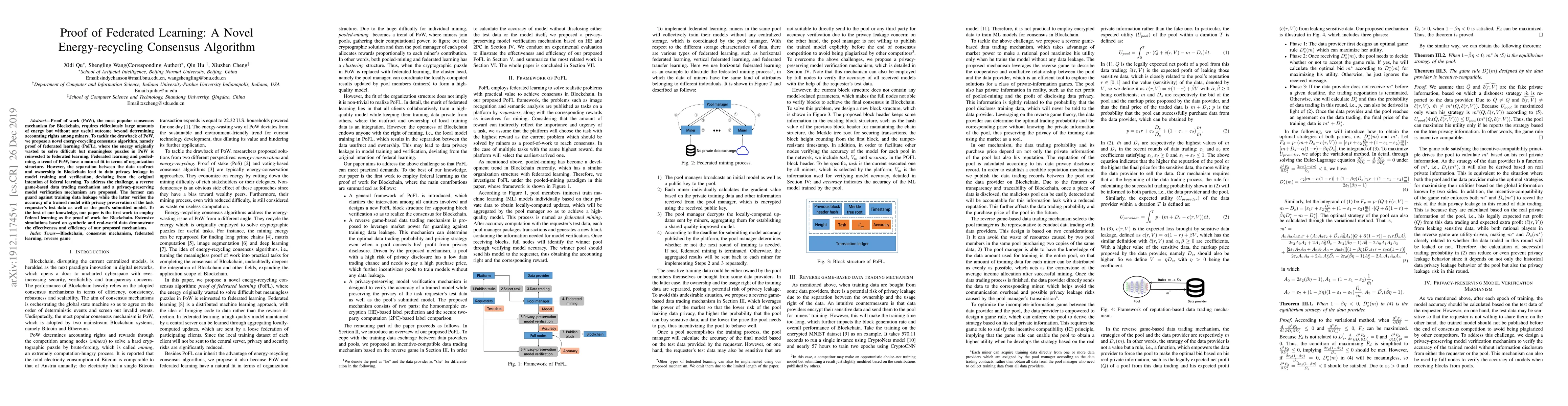 This paper proposes a novel energy-recycling consensus algorithm called proof of federated learning (PoFL) to address the energy inefficiency of traditional proof of work (PoW) in Blockchain. It integrates federated learning to recycle wasted energy and includes privacy-preserving mechanisms to safeguard data during model training and verification.