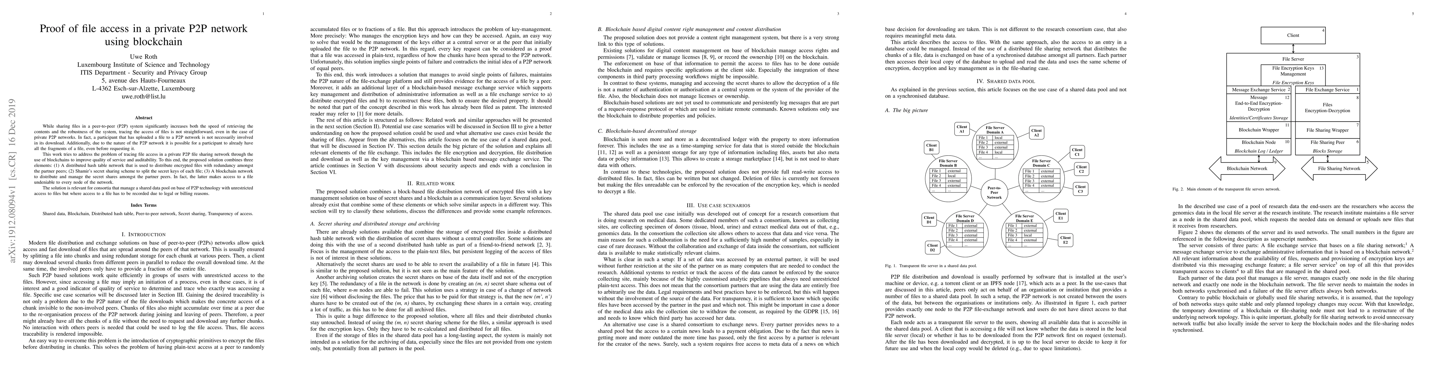 While sharing files in a peer-to-peer (P2P) system significantly increases both the speed of retrieving the contents and the robustness of the system, tracing the access of files is not straightforward, even in the case of private P2P networks. In fact, a participant that has uploaded a file to a P2P network is not necessarily involved in its download. Additionally, due to the nature of the P2P network it is possible for a participant to already have all the fragments of a file, even before requesting it. This work tries to address the problem of tracing file access in a private P2P file sharing network through the use of blockchains to improve quality of service and auditability. To this end, the proposed solution combines three elements: (1) A distributed hash table network that is used to distribute encrypted files with redundancy amongst the partner peers; (2) Shamir's secret sharing scheme to split the secret keys of each file; (3) A blockchain network to distribute and manage the secret shares amongst the partner peers. In fact, the latter makes access to a file undeniable to every node of the network. The solution is relevant for consortia that manage a shared data pool on base of P2P technology with unrestricted access to files but where access to a file has to be recorded due to legal or billing reasons.
