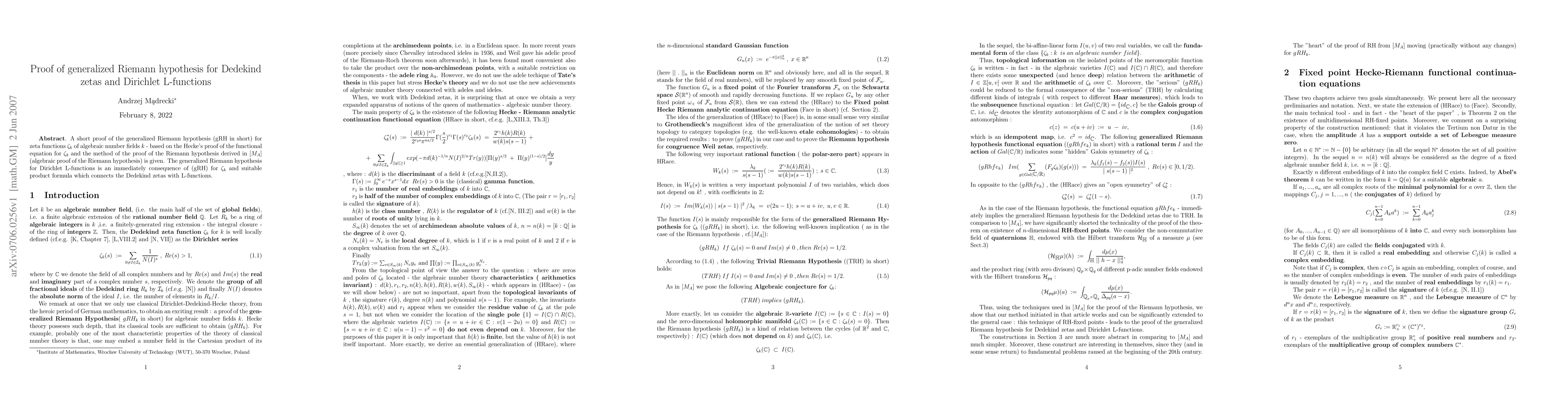 Summary: The paper provides a concise proof of the generalized Riemann hypothesis for Dedekind zeta functions of algebraic number fields, extending the result to Dirichlet L-functions through a connection via suitable product formulas. This builds on Hecke's functional equation proof and an algebraic approach from prior work.