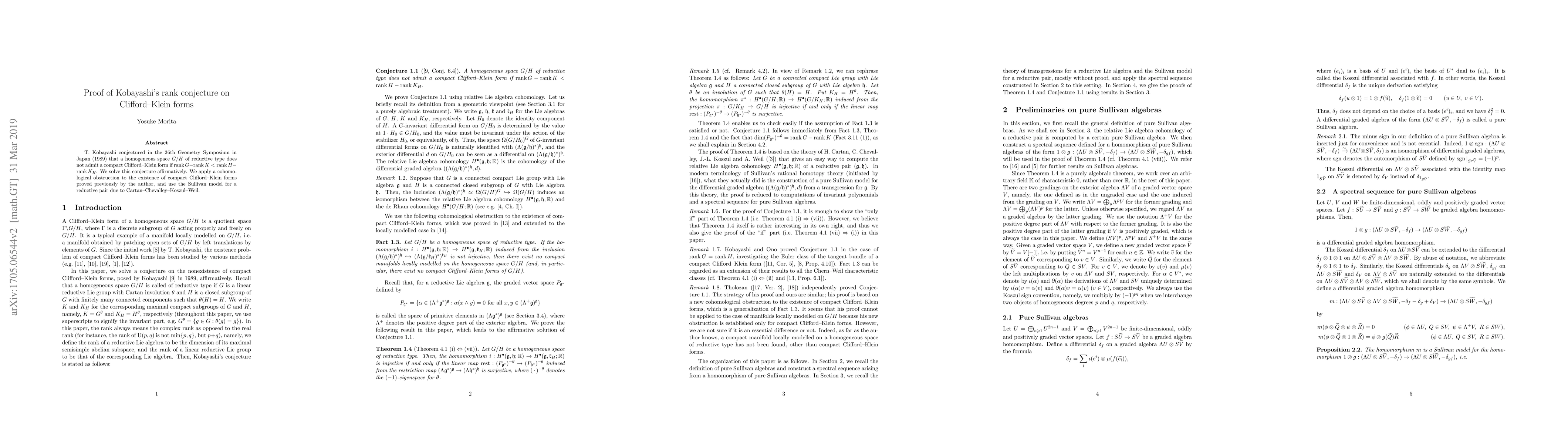 Summary: This paper confirms Kobayashi's rank conjecture for homogeneous spaces of reductive type, proving that a compact Clifford-Klein form does not exist under certain rank conditions. The proof leverages cohomological obstructions and the Sullivan model for reductive pairs.