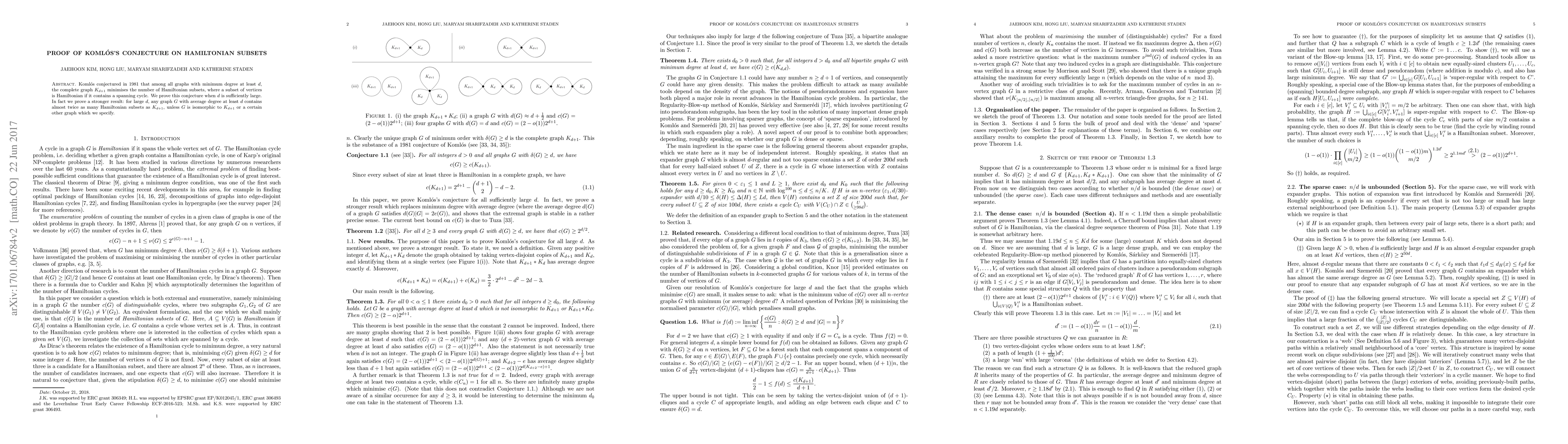 Koml\'os conjectured in 1981 that among all graphs with minimum degree at least $d$, the complete graph $K_{d+1}$ minimises the number of Hamiltonian subsets, where a subset of vertices is Hamiltonian if it contains a spanning cycle. We prove this conjecture when $d$ is sufficiently large. In fact we prove a stronger result: for large $d$, any graph $G$ with average degree at least $d$ contains almost twice as many Hamiltonian subsets as $K_{d+1}$, unless $G$ is isomorphic to $K_{d+1}$ or a certain other graph which we specify.